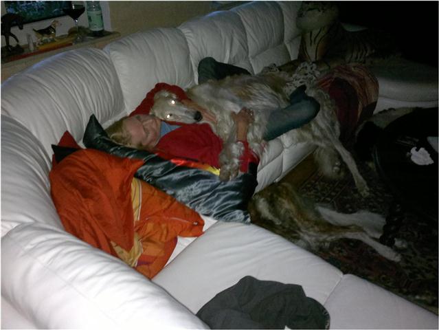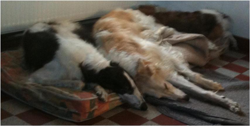 23.04.2012: wie, so fragen wir uns, soll Berendaij schönes, langes Fell bekommen, wenn er immer mit dem A..Rücken an der Heizung liegt ? How, so we us ask, Berendaij shall get beautiful, long hair, if he every time lies with his a... back on the radiator ? 21.04.2012:heute waren wir alle in Ostercappeln. Es war ein besonderes Highlight, dass die Barsois von einer russischen Richterin gerichtet wurden: Frau Deres. Für uns ist es interessant zu erfahren, wie unsere Hunde in ihrem Ursprungsland beurteilt werden. Wir hatten 4 Hunden gemeldet. Doch so wie wir dachten natürlich auch alle anderen und somit waren entsprechend viele Barsois am Start.