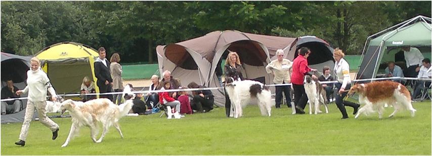 Today we all have been in Ostercappeln. It was a speciel highlight, that the borzois became judged for a russian Judge: Ms Deres. For us it is very interesting to learn how our dogs are beeing judged in there country of origin. So we have bayed 6 dogs. But like us naturally all the other once also thought and so there were proportionally many Borzois at the start. Berendaij today hat a bad day, er got very frightend in the ring, so we nearly toppled. He could not calm himself any more at all. Nevertheless for our kennel it was a very successful day: Berendaij got a V3 in the Junior Class, Niemen won the Intermediate Class with V1 and obtained into the toss against Nabat of the Oppen Class the VDH-CH-A and Res.-CAC. In The Open Class Ms Beres could not hardly decide between Maxim and Nabat: so Maxim got finaly V1, CAC and VDH-CH-A and Nabat V2 and Res.-VDH-CH-A. Michaela showed with Maxim, how good she can assert the dogs in the ring.