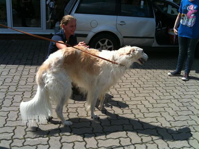 26.05.2012: wir waren alle in Gelsenkirchen ! Auf diese Ausstellung haben wir uns schon lange gefreut: die Leute sind freundlich, der Platz mit seinem Außenbereicht ist schön, es gibt immer etwas Leckeres zu essen und es sind immer ein paar Verkaufswagen da, wo man schöne Dinge für sich und die Hunde bekommt - und: man trifft viele nette Mitaussteller ! Auch Achim, mein Mann, war mit, besser ging es nicht ! Doch auch so ein Tag ist immer für Überraschungen gut: Bohdana wollte nicht aufstehen ! Sie hatte wohl so gut auf Idefix Bett geschlafen und das wollte sie so lange auskosten wie möglich ! Half ihr aber nicht: sie mußte mit! Vielleicht war das auch Taktik, denn so wurde sie von Achim auf den Arm getragen. Als wir angekommen waren und die Unterlagen holten, sahen wir mit Entsetzen: Bohdana war in der Jugendklasse der Rüden eingeteilt. Doch da zeigt sich die Freundlichkeit: kein Problem ! Es waren sehr viele Barsois gemeldet, denn Gelsenkirchen ist nicht nur bei uns so beliebt, doch das heißt auch: langes Warten in der Sonne ! Und da Herr Langer eine Richteranwärterin hatte: noch längeres Warten, da er viel erklären mußte. Für Bohdana war es ein richtiger Kulturschock: so viele Hunde und Menschen, Jubel, Trubel, Lärm und Gerüche ! Dann das kontrollierte Laufen und Stehen im Ring, mit einem eher fremden Frauchen. Doch sie meisterte alles. Aber als wir mit Richten durch waren, da konnten wir alle nach Herzenslust ( und Geldbeutel ) shoppen, ( fr )essen und genießen ! We all have been in Gelsenkirchen ! Long time we looked forward to this show: people are kindly, the place with the surrounding is beautiful, everytime is gives something delicious to eat and ther are always some push carts, where you can bay fine things for you and the dogs - and: you meet many kind exhibitors ! Also Achim, my husband, was with us, better it couldn `t. But also such a day springed a surprise: Bohdana didn`t want to stand up ! It meeded she had sleep so well in Idefix bed and she liked to enjoy it to the fullest ! But it did no good to do, she must with us ! Maybe it was generalship, cause Achim carryed her in his arms. When we arrived and looked into the catalog, we saw with horror: Bohdana was scaled into the male Youth Class. There it shows the kindnes: no problem ! There were many borzois signed, cause Gelsenkirchen is not only popular by us, but that meens: longe time waiting in the sun ! And cause Mr. Langer had a judge-aspirants, a little bit more longer waiting, for he must exclaim much. For Bohdana it was a real culture shock: so many dogs and people, rejoicings, embraces, noise odors ! Than the controlled running and standing in the ring, with a druther new mistress. Nevertheless she mastered all. But when we were ready with judging, we could shopping to our`s heart`s content ( and monybag ) , eating and indulge in the day ! ![]()