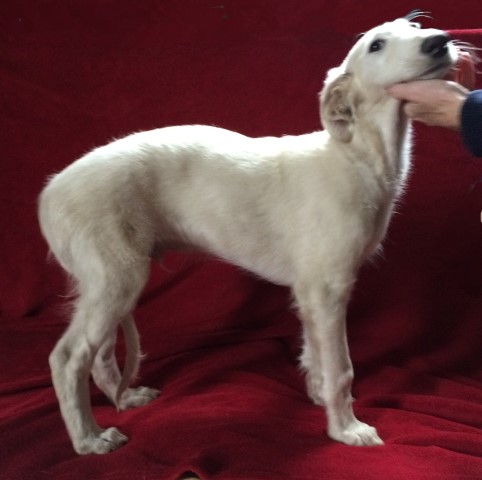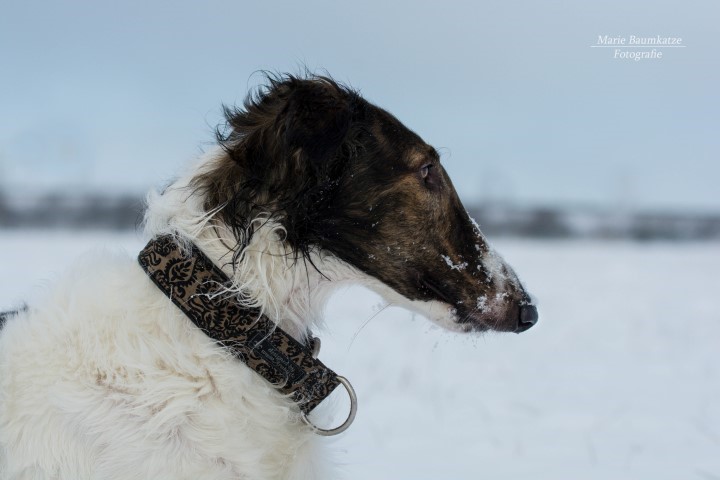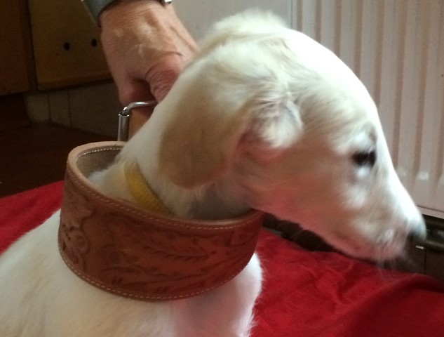![]() ![]() Wir fahren mit unserem "Lastwagen" langsam, ganz langsam gen Hannover, und das über die Dörfer! Aber wir kommen pünktlich, wenn auch etwas genervt, an. Bei der Rassevorstellung des VDH durfte ich mit Opal die Rasse Barsoi vorstellen. Opal war, wie üblich, am meisten genervt, er hasst Hallenausstellungen. Doch er stellte sich besser vor als in Dortmund und ging glücklich mit dem Jugend-BOB nach Hause. Auch Niemen gewann seine Klasse und Berendaij wurde in einer großen offenen Klasse dritter hinter Borzowski`s Phenomenon ( S ), der schon internationaler-, Dänischer-, Englischer-,Finnischer-,Norwegischer- und Schwedischer Champion ist und Richter A. van den Broek. Da es eine zahlenmäßig große Klasse war, wurde sie in zwei Gruppen aufgeteilt und ich freue mich sehr über die V3-Platzierung! 31.10.2014: Alpha-Macawi probiert schon mal seine zukünftigen Halsbänder aus:
