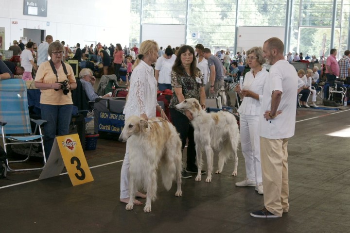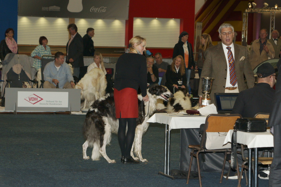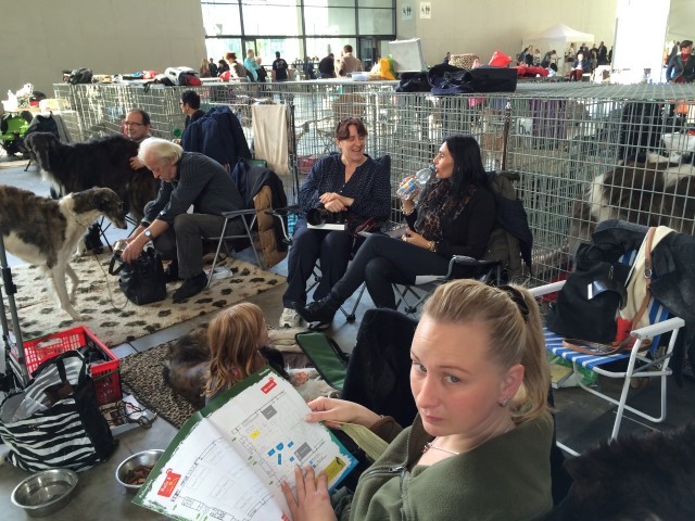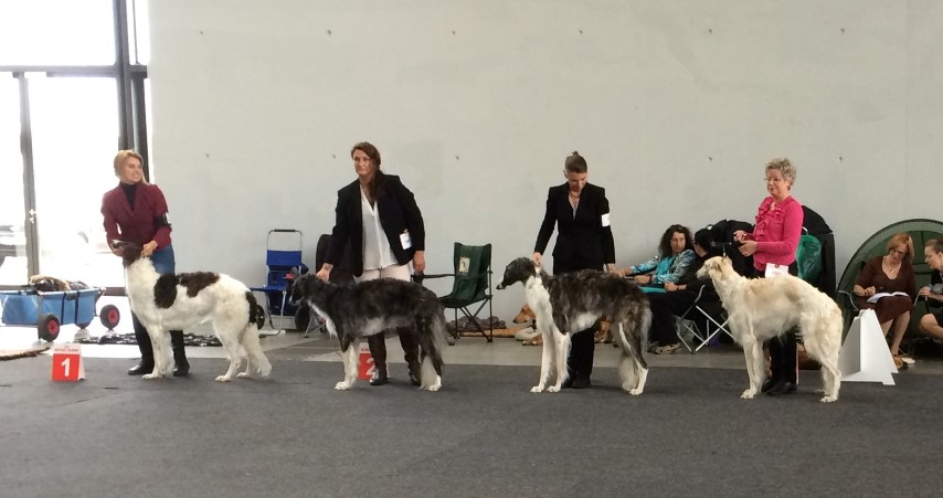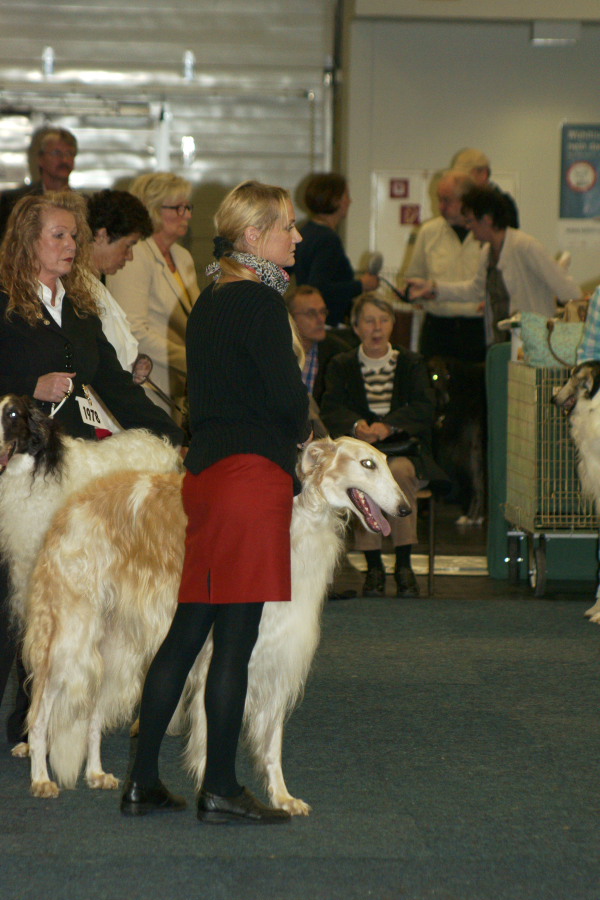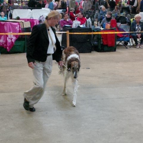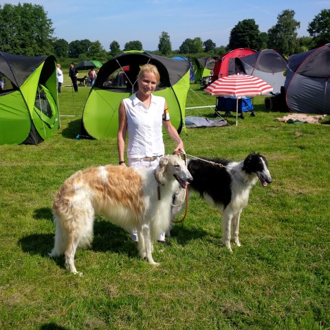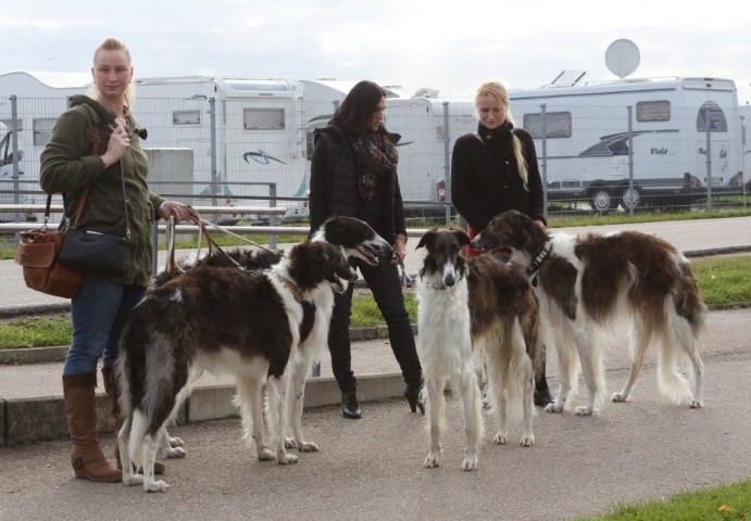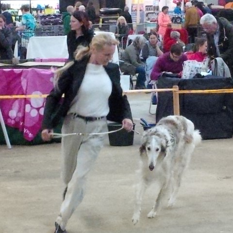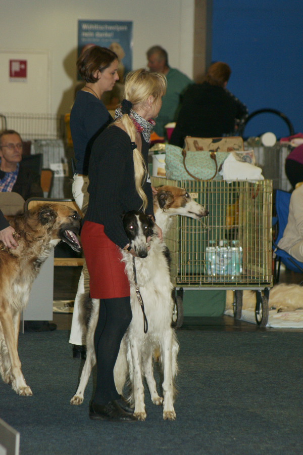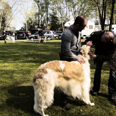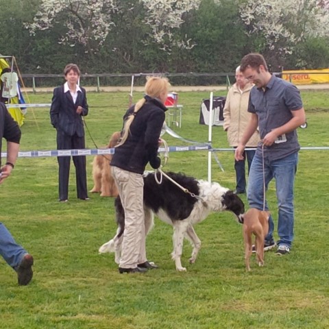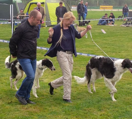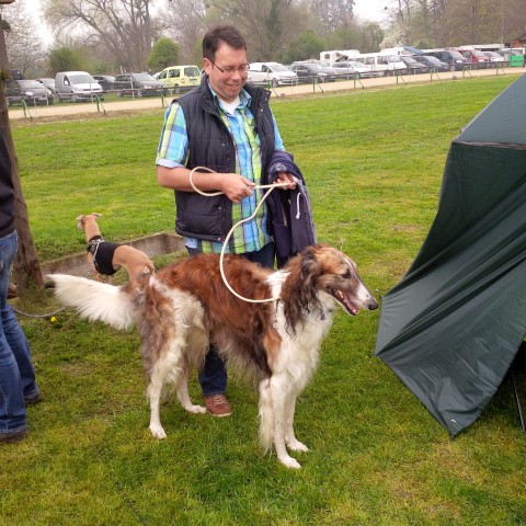 27.04.2014: Lingen! Eigentlich eine schöne Veranstaltung! Heute jedoch die 2. an einem Wochenende! Ich hatte es beim Melden nicht gerafft!Jetzt hatte ich das Problem! Und dann mit 2 Rüden, die O-Bock auf Ausstellungen haben! Ich hatte sie beide in der offenen Klasse gemeldet, dennoch war Maxim in die Championklasse gestellt worden. Nun gut! Wir hatten extem gute Mitbewerber: u. a. Frau Gielisse und Herrn Kuszyk, beide internationale Richter und Barsoizüchter! Mit beiden haben wir viel Spaß gehabt und wir haben uns austauschen können, was für mich immer einen extra Lerneffekt hat. Das alles war sehr schön, auch war schön, Claudia und Joyce wieder zu treffen. Maxim hat einen 3. Platz gemacht, einen sehr tollen Richterbericht bekommen, der zur Bewertung gar nicht passt, Nabat hat auch einen sehr tollen Richterbericht bekommen: V2, doch, wie gesagt: starke Mitbewerber! Nur das macht es ja interessant.