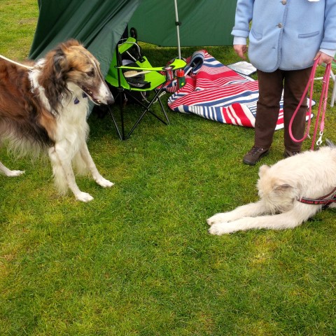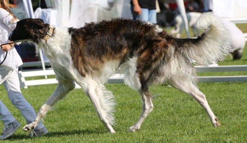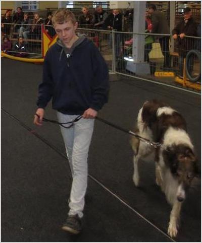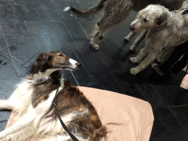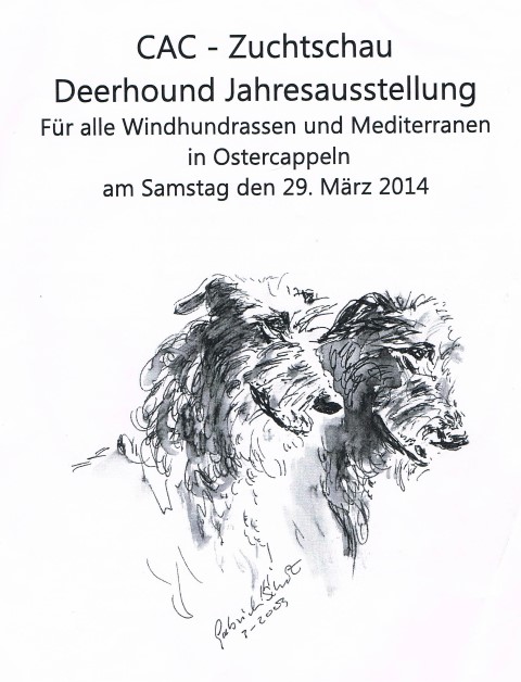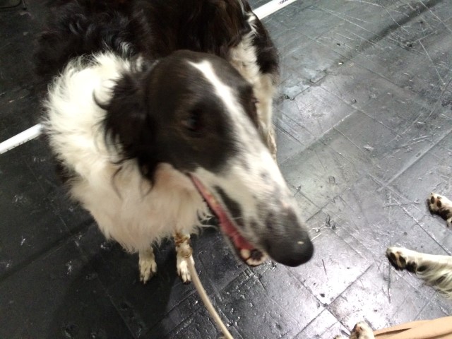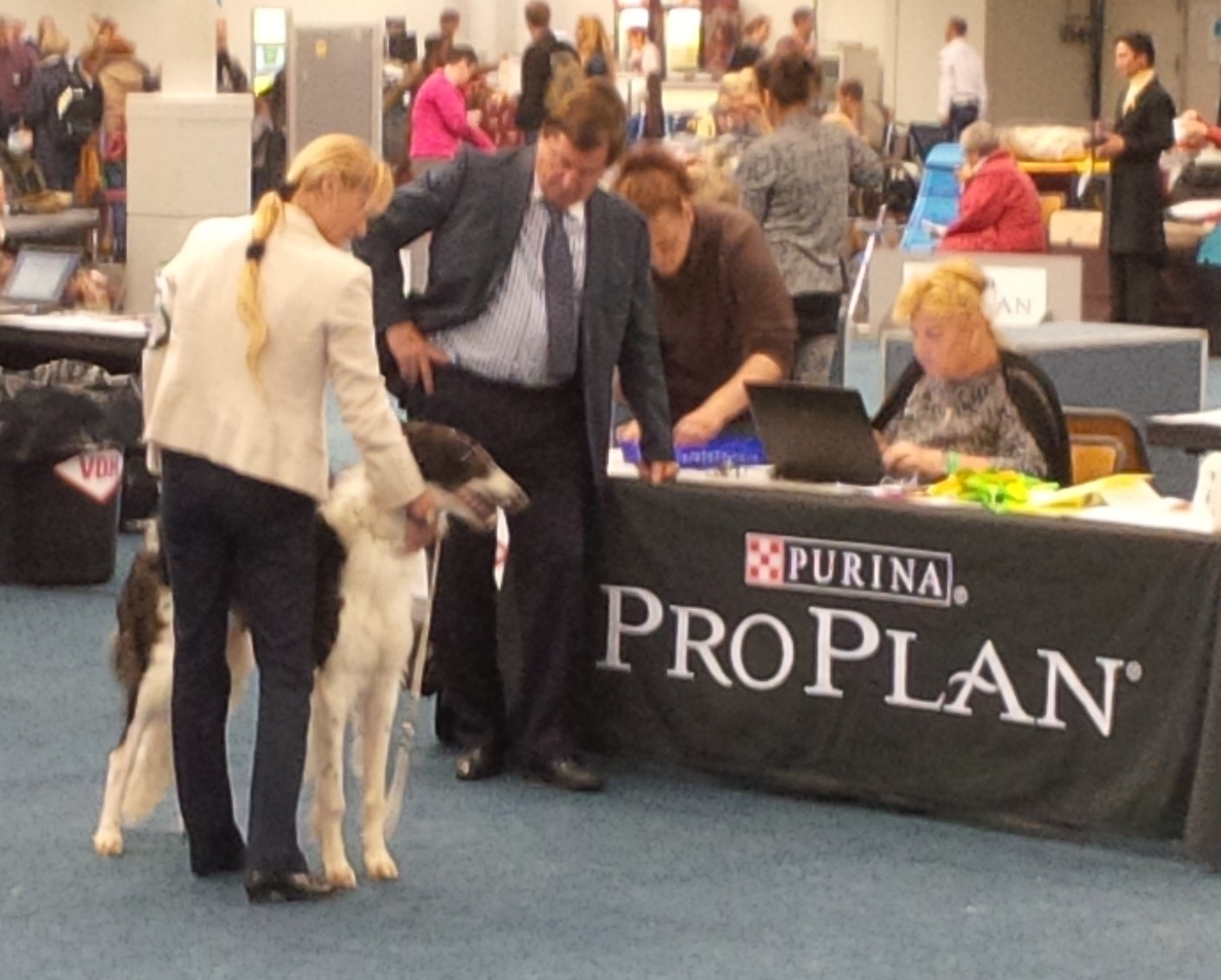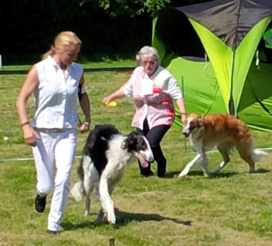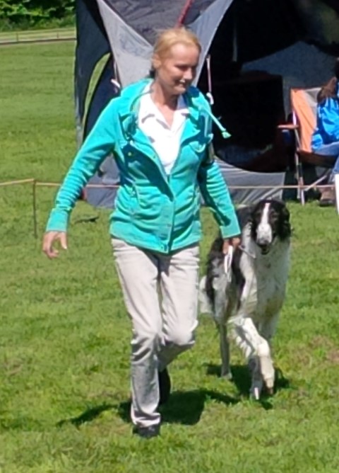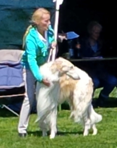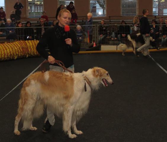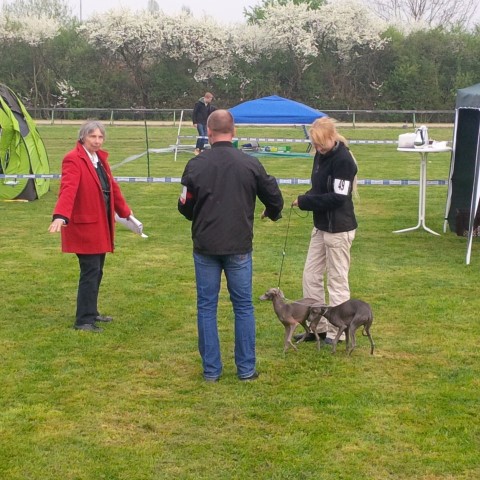 27.04.2014: Lingen! Eigentlich eine schöne Veranstaltung! Heute jedoch die 2. an einem Wochenende! Ich hatte es beim Melden nicht gerafft!Jetzt hatte ich das Problem! Und dann mit 2 Rüden, die O-Bock auf Ausstellungen haben! Ich hatte sie beide in der offenen Klasse gemeldet, dennoch war Maxim in die Championklasse gestellt worden. Nun gut! Wir hatten extem gute Mitbewerber: u. a. Frau Gielisse und Herrn Kuszyk, beide internationale Richter und Barsoizüchter! Mit beiden haben wir viel Spaß gehabt und wir haben uns austauschen können, was für mich immer einen extra Lerneffekt hat. Das alles war sehr schön, auch war schön, Claudia und Joyce wieder zu treffen. Maxim hat einen 3. Platz gemacht, einen sehr tollen Richterbericht bekommen, der zur Bewertung gar nicht passt, Nabat hat auch einen sehr tollen Richterbericht bekommen: V2, doch, wie gesagt: starke Mitbewerber! Nur das macht es ja interessant.