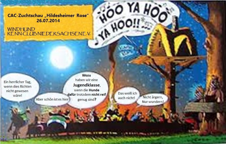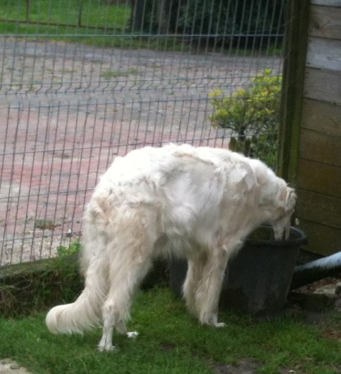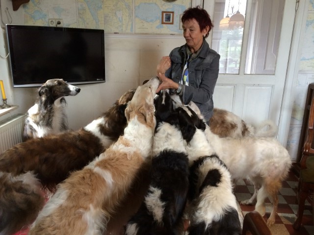 Christian mit Niemen und Berendaij mit mir vor Ronny`s Stand mit alten Steinen und Ziegeln. Ludwina bestach unsere Barsois mit leckerem Futter von Anifit! Sie wollten gar nicht wieder mit!!!! 26.07.2014: Hildesheim steht an, dort fahre ich immer gerne hin! Doch seit gestern regnete es hier "Bandwürmer!! Auch heute Morgen schüttete es aus Eimern! Niemen sah aus, wie ein begossener Pudel! Sollte ich fahren? Naja, man gönnt sich ja sonst nichts, und wie oft war das Wetter auch nur 50 km schon anders, als doch los. Kurz vor Hildesheim wurde es trocken, ich atmete auf. Eigentlich hatte ich ja auch Volia gemeldet, doch die ist ja läufig. Auf dem Platz angekommen, erfuhr ich von einen kompletten Richterwechsel! Hochachtung vor dem Verein, dass sie alles in letzter Minute noch organisiert bekommen haben!! Doch die Barsois wurden von jetzt von Herrn v. d. Broek gerichtet! Sollte ich dennoch ausstellen? Ich ärgerte mich innerlich über mich, wegen nur einem meiner Hunde hergefahren zu sein! Dann traf ich eine Ausstellungsbekannte, die mir erzählte, ALLE seien böse auf mich, weil ich einen Wurf mit High Society mache! Wer ALLE sind, weiß ich nicht, doch ich mische mich auch nicht in die Angelegenheiten anderer Züchter, und ich habe hier eine wunderschöne Hündin mit einem ausgezeichnetem Pedigree zur Zucht! Nur, weil die Vorbesitzerin aus nicht benennbaren Gründen von einigen im DWZRV für eine Persona non grata erklärt wurde, soll jeder von ALLEN bestraft werden, der mit ihr in irgendeiner Weise zu tun hat? Hm! Und - was kann der Hund dafür? Worum geht es hier, um unsere Windhunde oder um was? In der Ausstellung bekam Niemen sein V1, VDH, das war es erwartungsgemäß dann auch! Also: es hätte ruhig weiter gießen können, der Tag war eh gelaufen. - Doch wie heißt es immer so schön bei Asterix?: Alle? Nein, ein ....! Und so war es auch hier! Gerlinde und Gabi kamen aufmich zu und wir begrüßten uns herzlich! Auch waren Jürgen und Herbert da, Jürgen hatte mich schon gesucht! Und somit war der Tag schon aus seinem Grau raus! Riesig glücklich waren wir, als Jürgens Hündin Blandis aus der Veteranenklasse heraus das BOB machte!!! Und als die Barsois fertig waren, kam die Sonne durch, als hätte sie extra so lange gewartet! So saßen wir, zusammen mit Angelika und Lars im Schatten der großen Bäume mit unseren Hunden und ließen es uns gut gehen, erzählten, lachten, hatten Spaß, genau, wie bei Asterix! 25.07.2014: ich hatte mir solche Mühe gegeben, die Jungs für das "Showgeschäft" fit und Maxim und Niemen vor allem SCHLANK zu halten, denn gerade deren 2. Name ist FRESSEN! Nun erfuhren wir gestern von einer Richterumbesetzung in Hildesheim ( das hatten wir da schon einmal! Damit verbinden wir einiges! ), und Niemen war darüber so frustriert, dass er nachts in die Sattelkammer einbrach und sich den Bauch mit dem für heute für ALLE vorgesehenen Hähnchenfrischfleisch vollgeschlagen hat. Heute Morgen traute ich meinen Augen nicht, welch eine "Kugel"!!!! "Tüte" ( Nabat ) eckt überall an, ich höre immer klack, raaatsch, bopp, wenn er irgentwo hin will! Er tut mir von Herzen leid, doch er leckt die kleine Wunde, so dass sie am Heilen gehindert wird. Deshalb bekam er eine Tüte. Nun werde ich angesehen, als sei ich ein Schwerverbrecher, der ihm Übles angetan hat. Doch wir sind ja erfinderisch:
