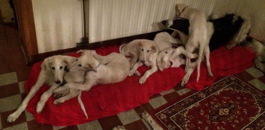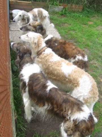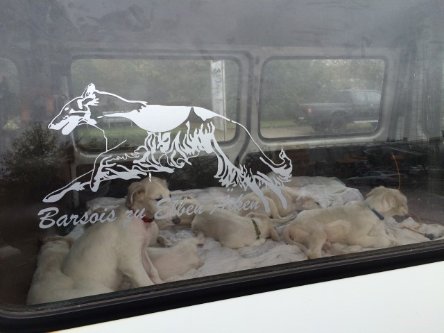 Jeder bekam einen halben Napf voll! Amethyst räumt gut auf! Aurora war auch bald fertig damit, ursprünglich waren Welpen und die Waschdecke mal weiß, die weiteren Bilder sparte ich mir! 27.09.2014: Gelsenkirchen ist angesagt, morgens um 06:00 Uhr ging es los! Bis Dülmen kam ich normal, dann setzte die "Motorsteuerung" ein: 80 KM/H! Dennoch ich war vor 08:00 Uhr da, doch auf dem "normalen" Platz war kein Parkplatz mehr zu bekommen: Alles voll mit Wohnmobilenund Wohnwagen! Auch war bald der "Auslaufplatz" voll mit PKWs! So voll habe ich es da noch nie erlebt. Viele nette Leute waren da, ich war froh, dass auch Frank und Christoph, Johanna und Kristian da waren. Es waren viele Barsois gemeldet, und so war ich sehr glücklich, dass Odaloij sein 2. Jugend-CAC bekommen hat. Auch Niemen hat sein V1 in der Siegerklasse mit nach Hause genommen, aber das war es auch schon, Herr v. d. Broek hat alle Male-Titel bekommen! Trotzdem ist meine Freunde ungetübt! Denn Odaloij`s CAC war mir wichtig! Nach dem Ehrenring zuckelte ich wieder mit 80 nach Hause, alle LKWs überholten mich. Doch dann, nach einer kurzen Pause, lief der alte "Shire" wieder richtig! Ich überholte freudig alle LKWs und brauste Richtung Dinklage! Genau vor der Abfahrt schaltete er wieder auf "Motorsteuerung"! Zumindest hat er mich nicht mehr blamiert! Ein langer Tag! Karin passte auf die Welpen auf, alles war gut! Alle sind wir müde und werden wohl gut schlafen! 24.09.2014: Heute wurde die Wurfbesichtigung, die innerhalb von 3 Wochen vorgenommen werden muß, da es ja über 8 Welpen sind, durchgeführt: Alles sehr o.K.! Das tierärztliche Attest war auch super: Mutter und Welpen in sehr guten Zustand! Was möchte man als Züchter mehr!?! 22.09.2014: Unsere Kleinen sind sehr frühreif! Sie klettern schon aus der Wurfkisten und ärgern damit ihre Mama, die sich gerne mal zurückzieht! Man sieht es wohl nicht so gut, aber einige liegen schon bei Muttern an der Milchbar, die das natürlich nicht so prickelnd findet! 15.09.2014: Das schrieb ich gestern Abend ( s. u. ). Doch dann fiel mir ein, dass momentan in der "Barsoi-Szene" von einigen "Barsoi-Liebhabern" nicht mehr unterschieden werden kann, was scherzhaft gemeint ist, wie z.B. unsere ursprüngliche, jetzt aus eben diesen Gründen geänderte Aussage zur nächsten Wurfplanung. Deshalb möchte ich das unten geschriebene doch noch einmal erklären: Ja, ich engagiere mich für den Tierschutz! Das tue ich gerne und mit viel Eifer. Zum andern bin ich auch für andere Veranstaltungen schon gebeten worden, die Rasse Barsoi der Öffentlichkeit vorzustellen. Für mich ist dabei sehr wichtig, dass die Hunde artgerecht gehalten werden; das bedeutet für mich nicht, dass sie auf Sofa und Bett gehalten werden müssen oder dass man sie vermenschlicht, sondern dass sie viel Zuwendung und Liebe bekommen und vor allen Dingen die Möglichkeit haben, sich ausreichend zu bewegen. Denn sie sind Jagd- und Hetzhunde, auch, wenn sie sich im Haus oder in der Wohnung gern wie ein dekorativer Teppich verhalten. Und nein, meine Barsois sind nicht im Tierheim gelandet, sondern waren nur mit, um die Rasse vorzustellen! Heute liegen sie alle wieder im Haus hinterm Ofen und freuen sich, es so gut zu haben! 14.09.2014: Das Tierheim Sedelsberg läd ein zum "Tag der offenen Tür". "Offene Tür?" fragten sich unsere Barsois, "das soll wohl ein schlechter Scherz sein! Wir sind hier hinter Gittern! "