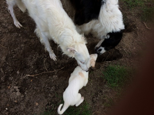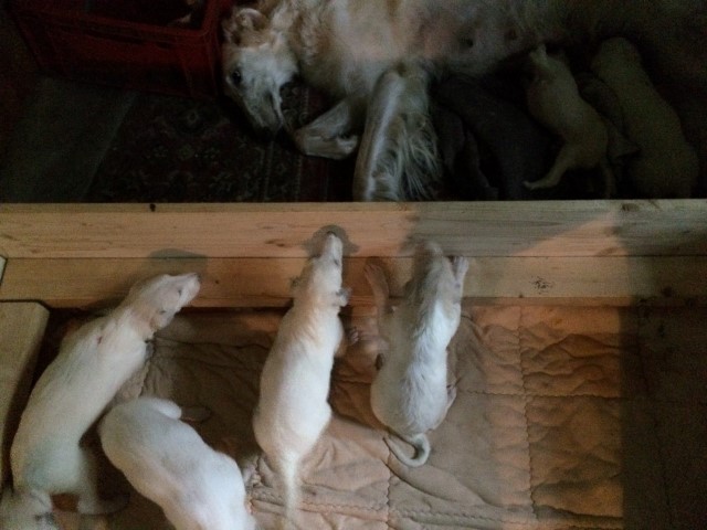 04.09.2014: Überraschung!!! Heute Morgen waren es 9! Ein Junge mehr! Alles wohl auf! (Alles Weitere unter: Welpen.) 03.09.2014, 20:45 Uhr: High stellte sich auf ihr Bett und flupp: Da kam auch schon der erste Welpe: Alpha! Damit hatte ich noch gar nicht gerechnet! Unser TA auch nicht! Um 21:20 h der nächste junge Mann, Um 21:45 h und um 22:50 h erblickten die ersten 2 Mädchen aus Licht der Welt und um 23:10 h wieder ein Junge! Das 6. Mädchen kam um 24:20 h zur Welt und die beiden letzten Jungs um 01:05 h und 02:15 h! Jetzt sind alle da, 8 ( 5/3 ) an der Zahl, und ich bin froh, dass alles so reibungslos abgelaufen ist! Mutter und Babys sind wohl auf! Karin, die sofort kam, hat kräftig geholfen, so war es für mich auch ganz entspannt, genau, wie bei High! 03.09.2014: Am Vormittag kam unser TA und brachte mir alles, was nötig ist, wenn es zu Komplikationen bei der Geburt kommen sollte. Da Karin und ich medizinisch sehr gut bewandert sind, sollte es keine Probleme geben. Und unser TA hat das Handy am Bett! Er untersuchte High noch einmal gründlich, ihr fehlt es an nichts, er rechnet mit der Geburt in den nächsten 2 Tagen, am 4. 9. wäre auch die Zeit um. 30.08.2014: Heute war Münster angesagt! Ludger machte sein Versprechen wahr und führ mit! Ich war völlig irritiert, weil wir nicht so richtig auf den Parkplatz kamen. Auch waren in der Bahn gar keine Ringe abgesteckt: In der Rennbahn war"Land unter"! Somit hatte man notgedrungen den hinteren Teil des Parkplatzes mit 2 Ringen bestückt! Eng, aber heimelig! Wir hatten mit dem Wetter Glück im Unglück: Es blieb so lange trocken, bis die Barsois durchgerichtet waren! Glücklich sind wir über das Jugend-CAC von Odaloij!!! Auch Niemen bekam sein V1! Leider hat Volia nur ein SG bekommen, sie war einfach zu "kahl" nach der Läufigkeit. Auch war es eine sehr große Klasse, doch wann, wenn nicht jetzt?! Immerhin hat sie schon ein CAC. Warum nicht noch mehr? O.K., nächstes Mal bekommt sie Extensions! Berendaij war unterdessen in Greppin ![]() und belegte V2, Res.-CAC. Er war ZU DICK! Und ich war doch so froh, dass er etwas zugenommen hatte, weil er MIR zu dünn war! Was soll ich dazu sagen? Trotzdem ein vorzügliches Ergebnis! 26.08.2014: Heute habe ich die Wurfkiste aufgebaut und schön weich ausgepolstert, damit High sich schon einmal daran gewöhnen kann. Volia wollte auch gleich rein! Während ich das mit ihnen ausprobierte, haben sich Opal und Odaloij vom Acker gemacht, besser, sie liefen auf dem Acker! Erst Opal, der froh war, als ich ihn rief! Sofort kam er angerannt! Dann sah Odaloij seinen Bruder nicht mehr und kroch auch durch den Tunnel! Aber auch er war froh, als er mich sah! Nichts Schlimmes passiert! Die beiden haben wohl zu viel Nachrichten gesehen und wissen nun, wie die Palästinenser aus Gaza ihre Tunnel graben! Ich hatte den ersten ja dicht gemacht, doch jetzt ist Schluß damit: Udo kommt gleich mit "schwerem Geschütz"! Dabei wollen wir den Hundeweidenzaun sowieso erneuern, allerdings erst, wenn Achim wieder da ist! High und Volia beim Fressen, die Wurfkiste und dann - High ganz entspannt in ihrem Refugium! Probeliegen!