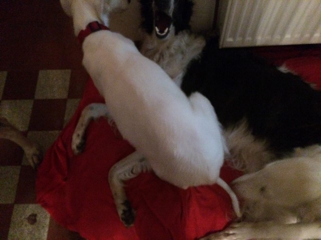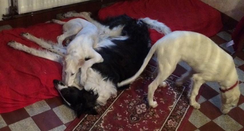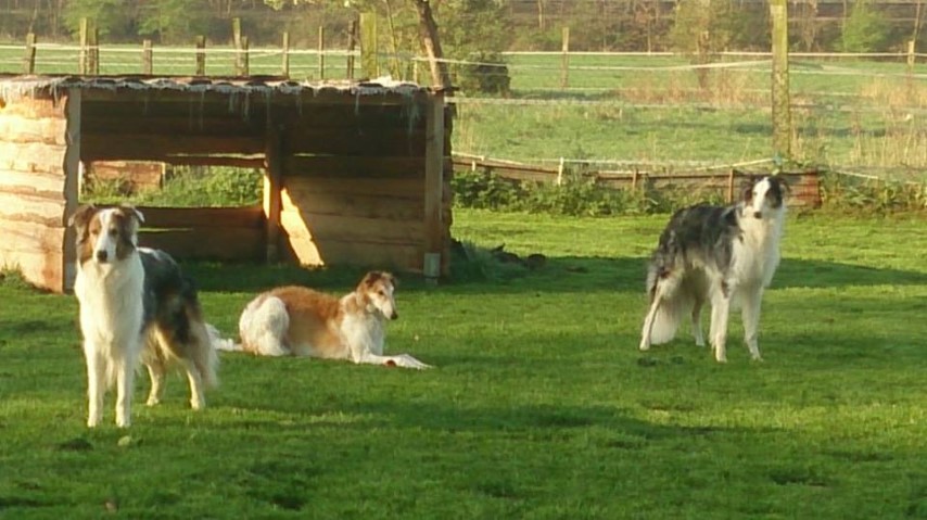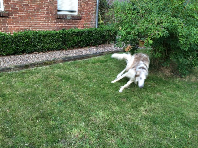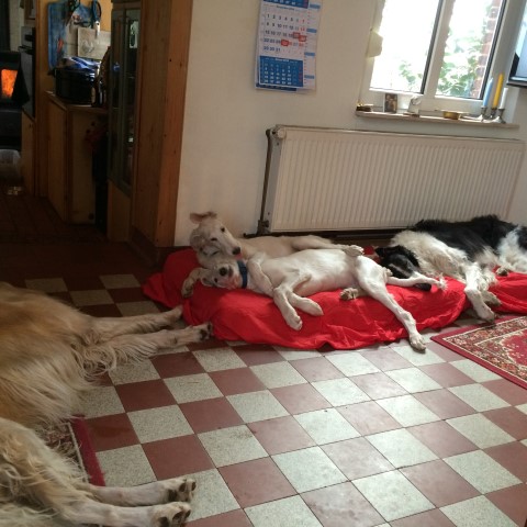 22.08.2014: Achim rief mich an: sag mal, willst Du den Scheckenverband sabotieren? ( Ich betreute deren website. ) Was war geschehen: Ich hatte auf deren website gearbeitet und dann etwas bei mir auf news geändert. Dabei habe ich beim Hochladen nicht gemerkt, dass ich den ZSSE-Ordner noch auf hatte und somit war meine news-Seite jetzt auch die der Schecken! Was mögen die wohl gedacht haben, wenn sie das gesehen haben!!!! Doch Schecken sind unsere Barsois ja auch! 21.08.2014: Welch ein Tag! Wir wollten die Pferdeweiden aufarbeiten! Dann jedoch haben sich Opal und Odaliy unter dem Hundeweidenzaun "gearbeitet", als ich ihnen ihr Frischfutter geben wollte, fehlten die 2! Ich suchte überall!!! Dann - völlig frustriert - fuhr ich nach Hause, wollte die Polizei informieren! Doch das Telefon blinkte: Ich sah: Nummer aus Höne! Also Rückruf: Eine meiner Lieblingsnachbarn! Elisabeth sagte: Vermisst Du 2 Hunde?- Ja!- Die haben aber etwas Mist gebaut! Mir rutschte das Herz in die Hose: Oh Gott! Hoffentlich nicht die Schafe!!!!! Nein, sie waren in den Hühnerstall eingebrochen!!! Auch schlimm!!!! Nun, es sind Lieblingsnachbarn, so haben wir erst einmal auf den Schrecken einen Schnaps getrunken und meine Nachbarn kaufen neue Hühner, so bin ich glücklich, dass es so abläuft und wir so gut miteinander können! Während dessen hatte ich den Hündchen ja Geflügelklein mitgebracht! Das hatte ich in der Eile in der Sattelkammer abgestellt. Nun war die High im Haus und die hat das gnadenlos ausgenutzt! So dick habe ich sie noch nie gesehen!!!! Vollgefressen konnte sie sich kaum noch bewegen! Oh, heute also nicht laufen! Aber morgen wieder! Sie ist trotzdem traumhaft lieb! Ich bin glücklich, dass sie bei mir ist! Hätte ich sie doch schon eher gehabt! Aber sie hat es gut hier und ist soooo relaxt, so wäre sie schon immer hier! Sie ist wirklich traumhaft und auch die Jungs kommen gut mit ihr aus und respektieren sie absolut!