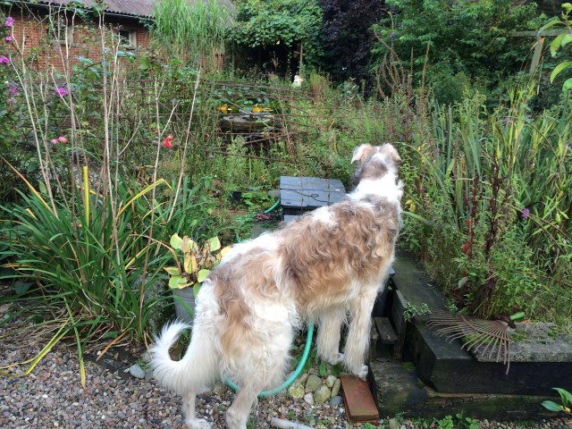 07.09.2014: Gerade hatte ich High hinten wieder gewaschen und machte das Bad sauber, da kam High wieder um die Ecke. Ich traute meinen Augen nicht!!! Wo war die denn drin?? Schwupp, war sie bei ihren Welpen verschwunden und wirkte äußerst zufrieden mit sich und der Welt. Ich gleich hinter her: Der Flur voll Dreck, die Küche voll Dreck, die Hündin voll Dreck! Oh!!! War sie im Teich? Also: Nachsehen. Wo Maxim und ich tags zuvor noch schöne Bilder machten, sah es aus, als hätte ein Mörser eigeschlagen! Ein fast knietiefes Riesenloch in meiner Blumenrabatte!!! Der Kiesweg nicht mehr zu erkennen!!! Ohh!! Auf den Bildern ist es gar nicht so recht zu erkennen! Ohh!!!