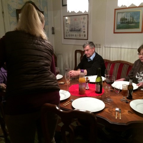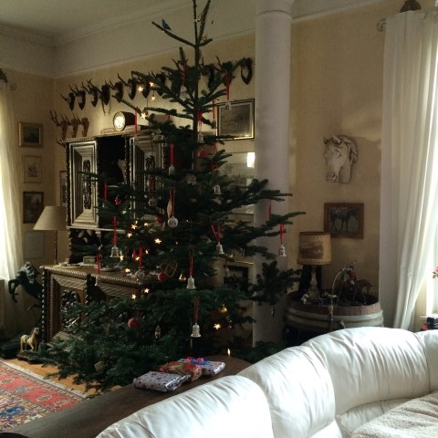 24.12.2014: Karin und ich hatten alle Weihnachtseinkäufe erledigt. Jetzt war bei uns noch der übliche Hausputz angesagt und natürlich die Essenvorbereitungen: Der Fisch wurde geputzt, die Lendchen geschnitten und die Ente mußte gewürzt werden, sie lag auf der Anrichte, ja, sie lag! Denn aktuell wurde sie vor einigen "Terroristen" in der Scheune zerrissen und gefressen! Oh!!! Weihnachtsbraten adé! Satte Terroristen, der Baum geschmückt, die "Köche" bei der Arbeit, die Gäste am Tisch warten auf den Braten.