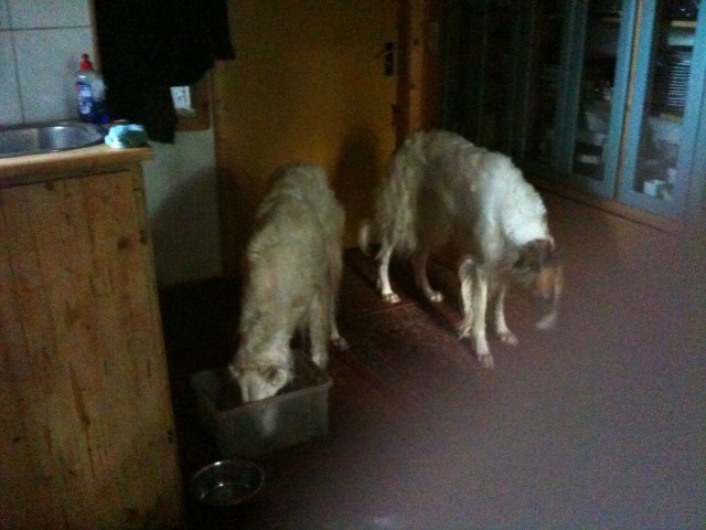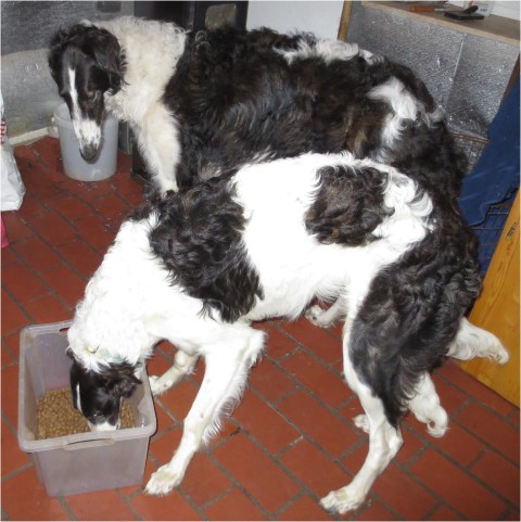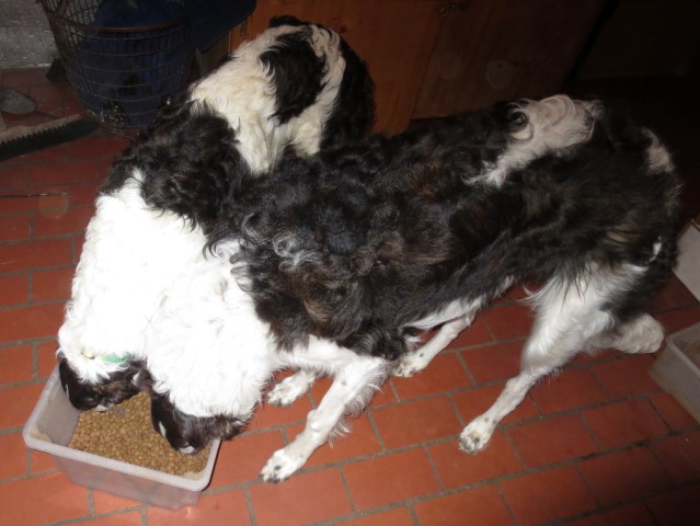 Wir wurden gebeten, die Rasse Barsoi dort einmal vorzustellen. Es waren viele interessierte und spendable Menschen da, und viele davon haben einen Barsoi in Natura noch nie gesehen. Ich führte eine Menge interessanter Gespräche und mußte viele Fragen beantworten. Hauptziel dieser Aktion war neben den Spenden auch, die Hunde und Katzen zu vermitteln. So kam ganz zielstrebig ein Mädchen mit ihren Eltern auf das Freigehege, in dem Maxim, Nabat, Niemen und Berendaij vorübergehend untergebracht waren, zugerannt und rief: Schei.., den ( Niemen ) will ich haben! 11.09.2014: So artig essen unsere Rüden aus einem Napf: Niemen und Opal! 08.09.2014: Opal bekam ein neues Futter: Anifit! Das haben ja auch Maxim, Niemen und Berendaij schon probiert und weil es ihnen so gut geschmeckt hat, habe ich es bestellt. Er konnte gar nicht genug davon bekommen und holte sich sogar die Dose wieder aus dem Müll, um sie gründlich auszulecken!