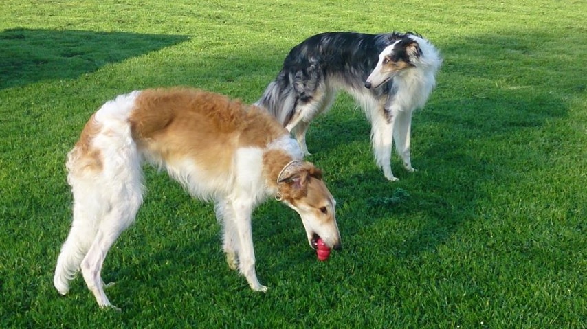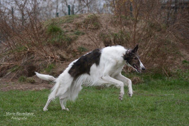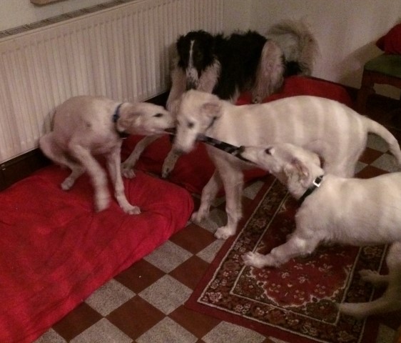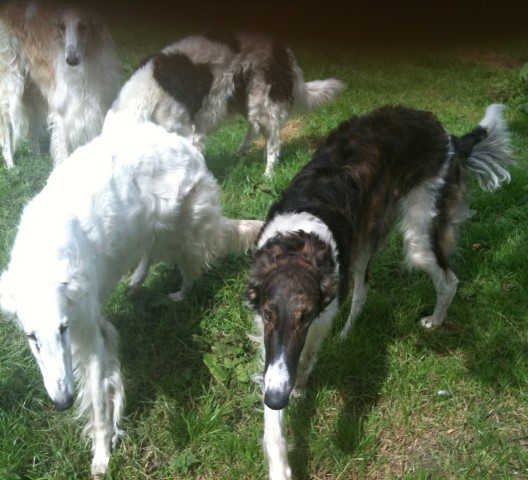 12.04.2014: "Im Nebel ruhet noch die Welt, ........... ": Volkmarsen! Doch dann kam die Sonne und es wurde sehr schön! Allein mit 4 Barsois, das war schon eine Herausforderung! Doch Christoph und Frank waren auch bald da. Opal war als erster dran, doch er hatte starke Mitbewerber, vor allem beim BOB und später auch beim "Best in Show", da waren neben ihm 6 schöne Windhunde anderer Rassen. Niemen hätte noch die Krallen geschnitten bekommen müssen, so knapp war die Entscheidung zu V1, Maxim hätte auch ein wenig mehr zeigen können, doch den Vogel schoß Nabat ab!!! An ihm gab es nichts zu bemängeln, außer: völlig lustlos!!! So steht es auch im Richterbericht! Ich mußte unseren Sportler förmich um den Ring ziehen. Hätte ich ein Fahrrad gehabt, sähe das völlig anders aus. Doch das hat ihm definitiv den vorderen Platz gekostet! Da er sich jetzt schon das 2. Mal so gegen das Ausstellen wehrte, werde ich es ihm auch nicht weiter zumuten! Er ist auch so ein toller Hund, der in vielen Ausstellungen seine Qualität schon bewiesen hat. Wenn es geht, werde ich mit ihm auf Coursing gehen. 11.04.2014: Neue Fotos von Oleg, er spielt gerne mit seinen Freunden und ist glücklich: