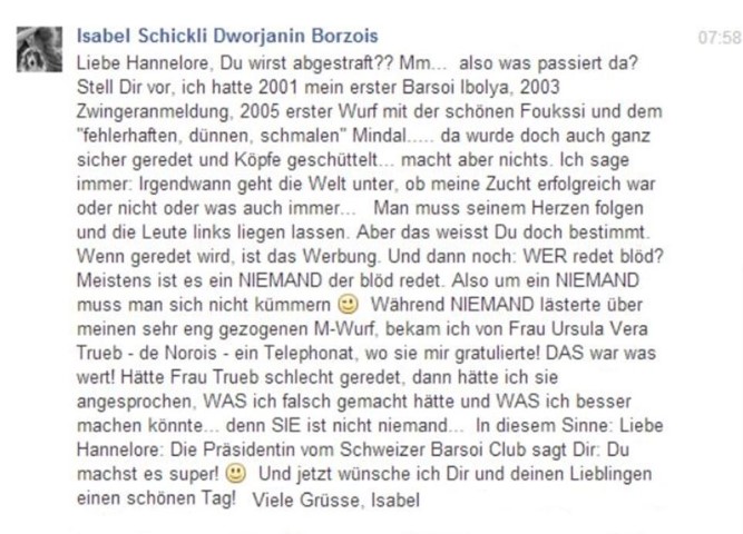 ![]() 05.05.2014: In der "UW" vom 03/2014 stehen die "Top-20 - Ranglisten" der verschiedenen Windhundrassen. Ich war hoch erfreut, dass sowohl Berendaij als auch Niemen darunter sind! Immerhin von 134 Hunden, die in die Bewertung fielen. Dabei habe ich beide gar nicht so viel ausgestellt, wenn ich das mit anderen vergleiche. Mich wunderte nur, dass Berendaij vor Niemen steht. Somit habe ich das mal mit unseren Ergebnissen verglichen und kam auf folgendes Ergebniss: Niemen wurde in 2013 insgesamt 19 mal ausgestellt und hatte 18 V-Platzierungen, nicht. Einmal bekam er in der Siegerklasse ein SG2, und das in unserem schönen Nachbarland Holland! Barsois sind bei Ausstellungen inzwischen in großer Zahl vertreten und stellen eine der größten Ausstellungsgruppen, so dass ein Barsoi, der in der Siegerklasse startet und diese auch schon unter großer Konkurrenz mehrfach gewonnen hat, seine CAC`s und/oder VDH`s also nicht auf Grund nichtvorhandener Konkurrenz erworben hat. Immerhin nennt er 2 CACIB`s sein eigen und sollte erstmals !international" starten, um auch da internationale Championat zu bekommen. Ein letztes Jahr 2-jähriger Rüde, der schon in der Championklasse startet, mit einem "noname" wie mir am Ende der Leine, das soll schon was heißen! Und so frage ich mich schon, wie diese völlig aus bem Rahmen fallende Bewertung für mich zu bewerten ist. Das zu erwähnen bin ich diesem tollen Hund mit seiner ehemals traurigen Lebensgeschichte einfach schuldig!