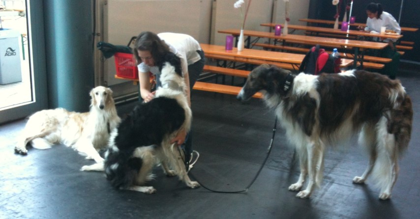 2 Vorträge und die Vorstellung der Rasse Barsoi: Opal, Niemen und Berendaij, unsere 3 Jüngsten, sind dabei. Hagen geht mit den Hunden, ich stelle anhand von Niemen den Barsoi und seine Historie vor.