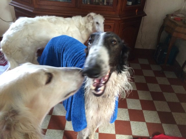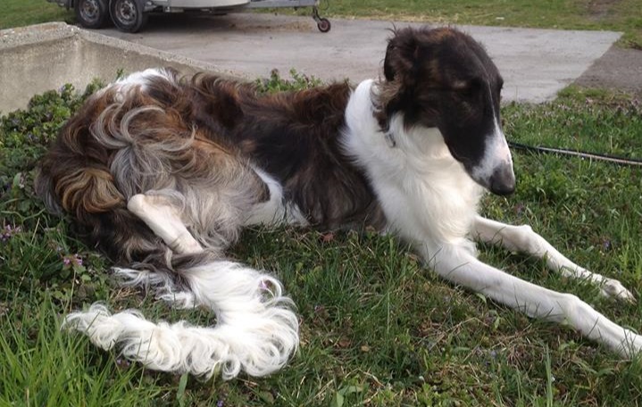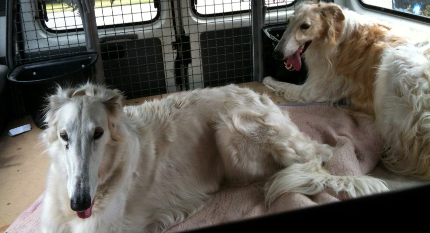14.05.2014: Ich habe lange überlegt, was Nabat will. Und er scheint nicht gerne auf Ausstellungen zu gehen, obwohl er sehr erfolgreicht ist und war. Es ist einfach nicht sein Ding: er will lieber laufen, schnell, doch nicht im Kreis. Ich will seine Meinung respektieren! Zumindest jetzt! Solange er von uns durch den "Ring" gezogen werden muß, weil er "null Bock" hat, braucht er nicht mehr ausgestellt werden. Sobald er signalisiert, gerne ausgestellt zu werden,ist er selbstverständlich wieder dabei! Dabei ist er ein echter "Hingucker", wie man ihm auf vielen Veranstaltungen testiert hat. Schade, dass er so lustlos bei Ausstellungen ist, vor allem, wenn man ihn sieht, wie angagiert er mit Achim "Fahrrad" fährt!!! Dann flippt er förmlich aus! Doch wir respektieren den Wunsch und Willen unserer Hunde. 13.05.2014: Es ist immer wieder toll zu sehen, wie sozial Niemen ist! In "unterwürfiger" Position, also als ranghöherer Rüde liegend, fordert er Opal zum Spiel auf! Er ist sein Vorbild und Mentor! Welch ein Hund! Ich liebe ihn sehr! 10.06.2014: Ein Tag zwischen Himmel und Hölle! Mit dem Pferdeanhänger im Schlepptau, einem nicht 100%ig laufenden Auto, einem kranken, eher nicht gut gelauntem Mann und 3 lustlosen Barsois nach Dortmund! Ach ja, und es regnete! Am Ring: kein Platz mehr, also: alle rücken zusammen ( schön ). Wir sind mit Opal in der Jugendklasse als erster dran, und: gewinnen! Dann Maxim in der Championklasse: Und wir gewinnen die Siegerklasse! Jetzt ist Maxim Doppelchampion!!!! Dann Nabat in der offenen Klasse: Nein, wir gewinnen nicht, doch wir werden V3-platziert. Dann Jugend-BOB und zusätzlich der Titel Frühjahrssieger! Rückfahrt: Die Hunde kauen Ohren, wir sich auch froh! Opal bellt, muß pieseln ( ? ), wir suchen den nächsten Parkplatz auf, halten, Opal raus, es beginnt zu regnen, Opal will nicht! Weiter! Dann: Tanken! Wieder runter! Kaum wieder in Fahrt: Polizei! Und ich habe ja keine Papiere mehr, doch die Anzeige bei mir! Dauerte etwas, sehr freundliche Polizisten, alles war i. O., weiter! Dann: Was essen wir heute Abend? Burger? Also: Das 4. mal runter von der Bahn! Dann gehts weiter. Opal bellt, muß immer noch pieseln ( ? )! Jetzt wird aber durchgefahren, vera..... können wir uns selber! Zu Hause angekommen: Alles ist gut! Das Auto hat es auch geschafft! Unser guter, alter "Shire"! ![]()