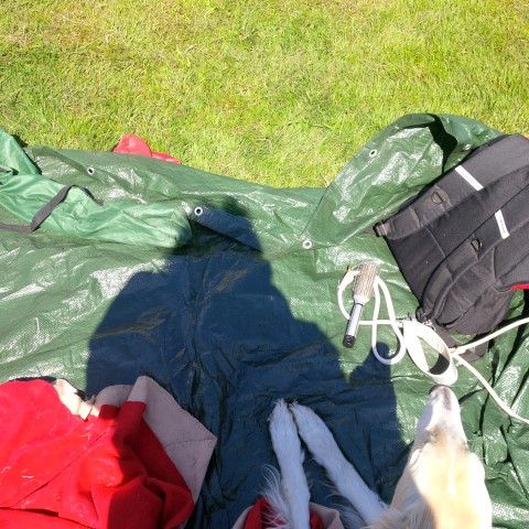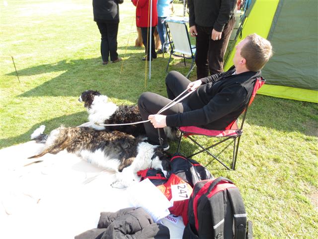 Das Wetter war toll, doch der Platz "schwamm"! Die Hundedecken blieben auf der Plane trocken. Opal und Niemen in Aktion.
