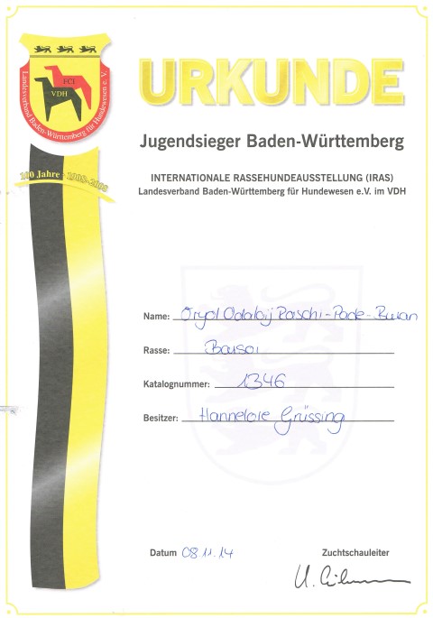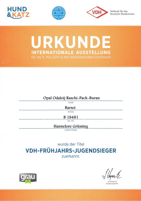 06.11.2014: Heute war wieder ein spannender Tag für die "elben Äikener": Niemen brach zum Kennel "Raschi-Pack-Buran" auf, denn Bohdana, die schöne Schwester von Berendaij, ist läufig und so soll Niemen zum 2. mal "Vater" werden! Im Gegenzug kam Odaloij wieder zu uns nach Dinklage, seinem 2. Zuhause. Danach wurde Alexej abgeholt und ist gut in Bremen angekommen. Da wir morgen nach Karlsruhe aufbrechen wollen, habe ich Berendaij schon zu Christoph nach Soest gebracht, damit die Hunde genügend Platz im Auto haben und alle bequem reisen können, denn auch Aron fährt mit uns und wird zu seiner neuen Familie gebracht. Jetzt heißt es, alles einpacken, damit wir morgen nichts vergessen! 01.11.2014 CAC JG2.11.: Und wieder machten wir uns auf den beschwerlichen Weg nach Hannover! Diesmal jedoch nicht über die Landstraßen! Doch da unsere fahrbare Hundehütte über 80 km/h momentan nicht hinauskommt, dauerte es wieder sehr lange, ich war um 5:00 Uhr losgefahren. Niemen hatte ich zu Hause gelassen, da ich alleine los mußte. Doch das war eine Überraschung: Berendaij und Opal waren so entspannt, so konnte auch ich mich entspannen! Opal war als erster dran, er hatte starke Konkurrenz, vor allem - wesentlich ältere. Und er brauchte ja nur noch ein VDH von der CACIB, um VDH-Jugendchampion zu werden....... ! Und Opal hat Grund zum Feiern: Ab heute ist er auch VDH-Jugend-Champion!