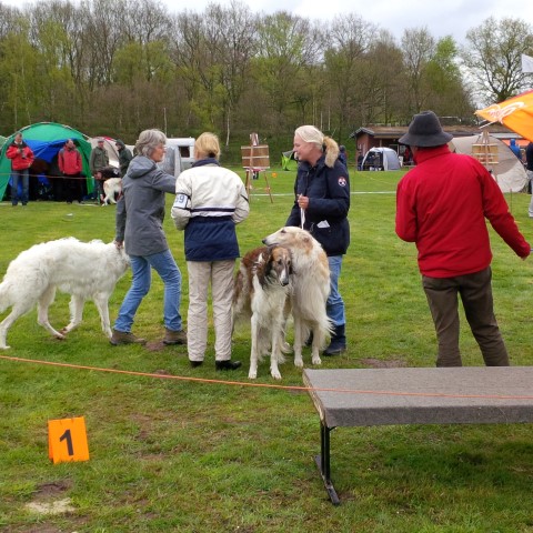 18.04.2014: Landessieger-Ausstellung in Hoope! Ich bin eingeteilt als Ringordner bei Herrn Dux, Belgien. Das hat sehr viel Spaß gemacht, ich habe viel gelernt und mit Sabine Wirbel waren wir ein gutes Team. Wettermäßig ging es so, das eine oder andere Regenschauer erwischte uns schon. Ich konnte unsere Barsois trotzdem Streß-frei bei Frau Peschges ausstellen, Achim bürstete die Hunde und Joyce half mir beim Stechen, ganz lieben Dank dafür! Mit Nabat lief ich mit "Oenk-Oenk" durch den Ring, das Zauberwort zum Radfahren! Und er lief!!!! So haben wir alles gewonnen, was für uns ging! Wie sehr ich mich gefreut habe!!!!!!
