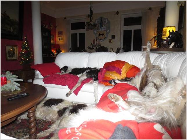 20.12.2014: Wenn eine Profi-Fotographin Fotos macht, dann können sie nur schön sein: Oblonka und ihre Freundin im Advent! Danke, liebe Marie, für diese schönen Bilder! ![]() ![]() 15.12.2014: Heute hatten wir lieben Besuch: Wilfried und Frank mit ihren 3 Barsois. Bei Kaffee, Tee und selbstgebackenem Kuchen ( von unserem Besuch ) haben wir uns viel zu erzählen gehabt und auch die Hunde waren in der für sie fremden Umgebung ganz entspannt. Unsere 3 "Edelsteine" rasten von draußen in die Küchen und waren ganz entsetzt, als da plötzlich 3 fremde große Barsois standen, doch ganz schnell merkten sie, wie freundlich und lieb diese waren und alles war gut. ![]() Alle Hunde, ob groß oder klein, ruhen entspannt durcheinander. Schau mir in die Augen Kleiner! Und Du mir auch! Liebe auf dem ersten Blick mit Aqumarin? 12.12.2014: Das Wetter ist derart mies, so dass wir draußen nichts tun können. Also renovieren wir die Küche, denn die hat es dringend nötig! Dadurch, dass unsere Hunde alle im Haus leben, haben die Wände es nicht leicht! Jetzt sind sie wieder schön sauber, fragt sich nur, wie lange! Die "Klebeprobe", Achim streicht, ich habe gestrichen, alles wieder sauber, die "Maximecke" und auch die "Battiecke"! 11.12.2014: Die kleinen Teufel mit Frauchens Socke! Amethyst stellt fest: Der Napf ist leer! Aquamarin ist satt! Achat ist vollgefressen!