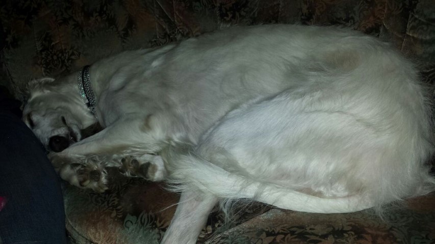 Nabat wird jetzt nur noch "Tüte" genannt. Frauchen`s T-shirt passt ihm auch! 24.07.2014: Am 21.07. stand für uns fest: Wir machen noch in diesem Jahr den 2. Wurf, obwohl ich Bedenken hatte, weil das alles im Winterhalbjahr stattfinden würde. Doch ich ließ mich umstimmen und war guter Dinge. Wie viele Überlegungen haben wir uns alle gemacht, wer am besten von den Rüden passt, und dann wir hatten uns entschieden: Maxim! Doch trotz des momentan schönen Wetters setzten immer wieder bei mir die Bedenken ein: die Welpen können draußen nicht so schön spielen, alles ist naß, kalt, früh dunkel! Und dann entschied ich, bis zur Frühjahresläufigkeit zu warten. Die Rasse stirbt ja nicht aus, wenn wir warten und für die Hunde ist es viel schöner! 18.07.2014: Jetzt wird auch Volia läufig!!! Doch 2 Würfe, zwar mit gebührendem Abstand auf einander folgend, in einem Jahr? 17.07.2014: Batti hat sich geratscht, ein kleiner Riss im Fell, ich bemerkte es am Abend gar nicht!