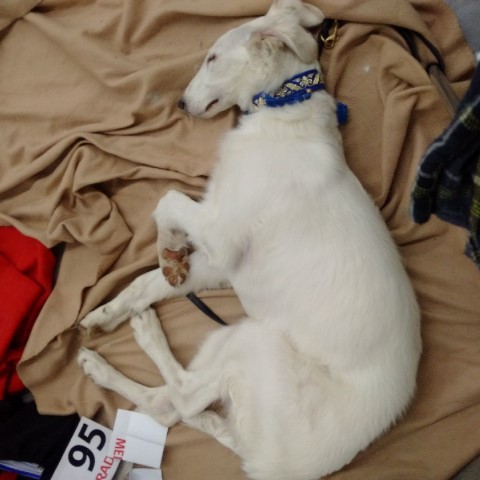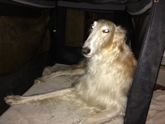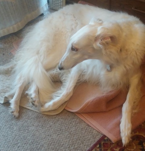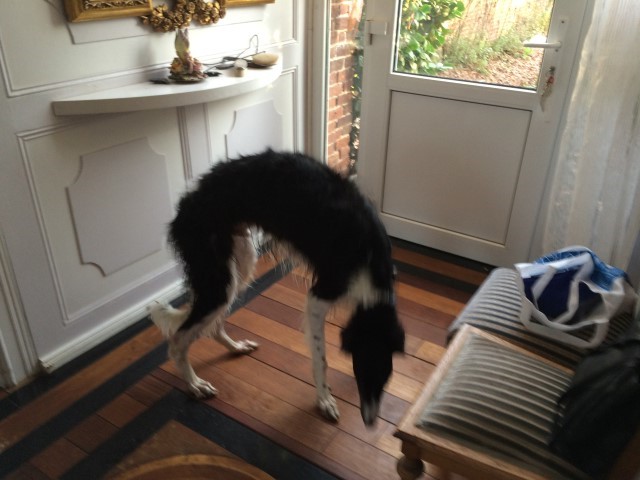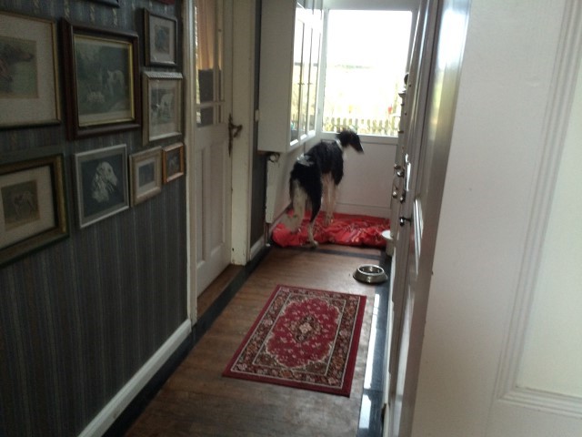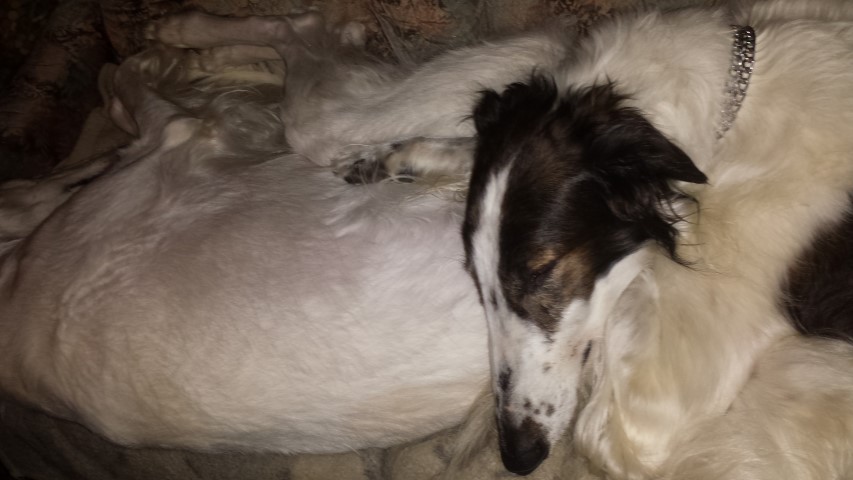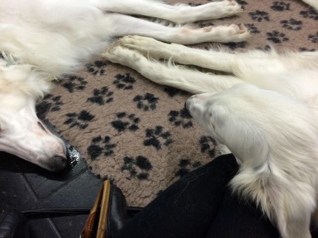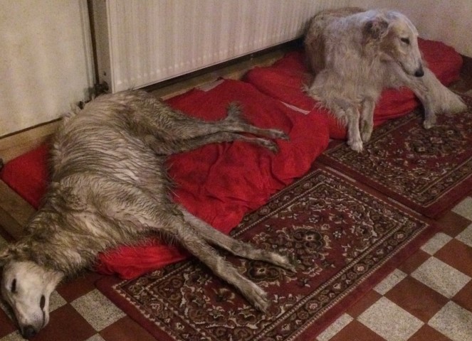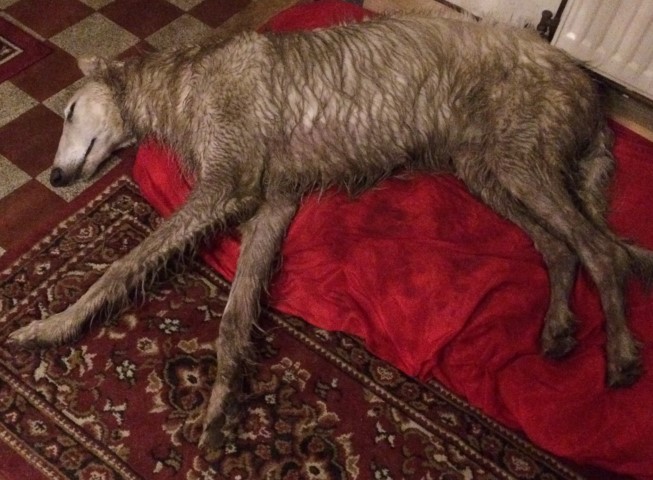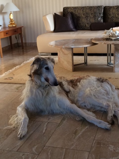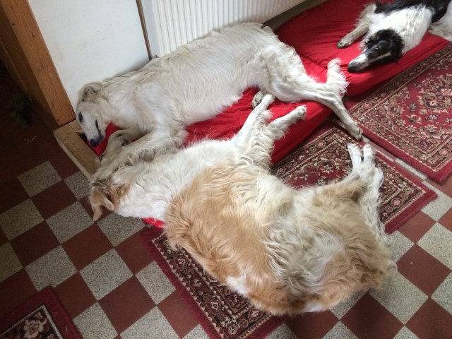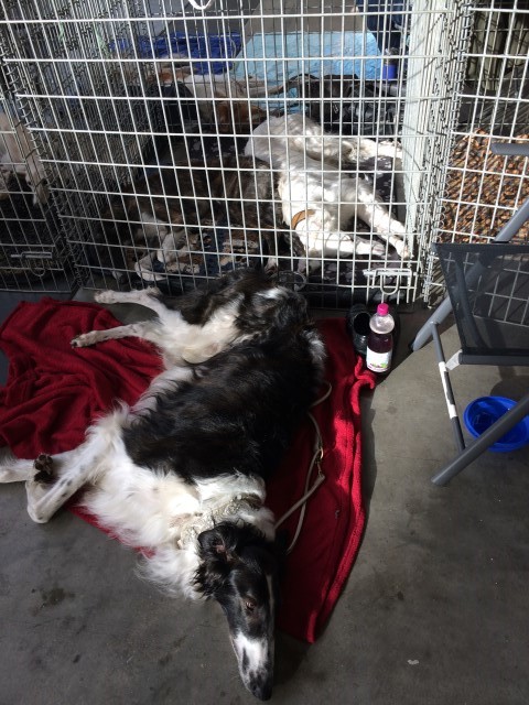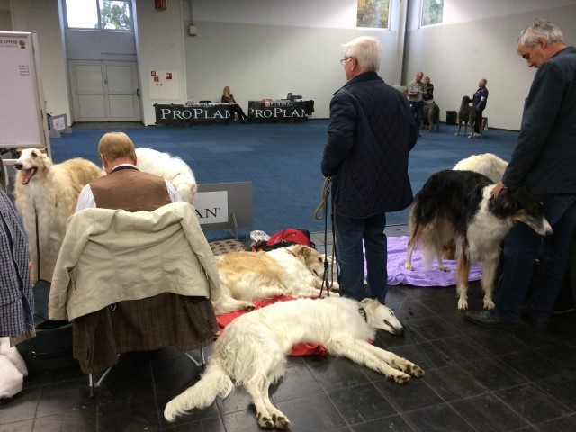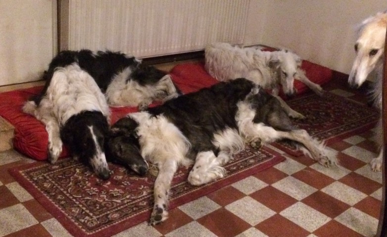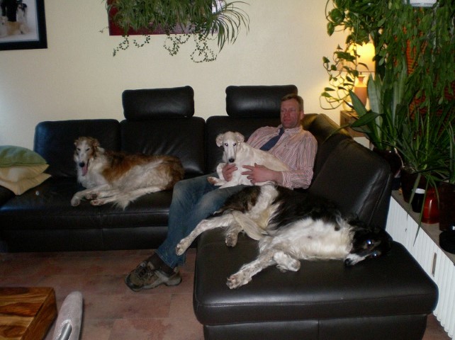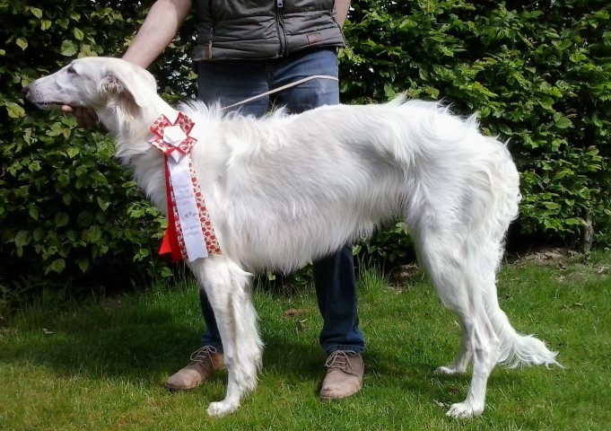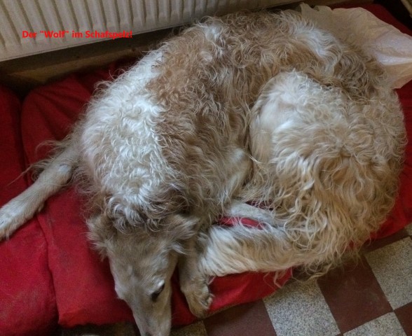 24.05.2015: So kann auch nur ein Barsoi liegen: 23.05.2015: Gelsenkirchen, sonst immer eine Reise wert! Irgendetwas nehme ich immer mit, und sei es die Erinnerung an einen schönen Tag in lieber Gesellschaft! Das Wetter hielt! Wir hatten einen schönen, großen Ring und wir alle waren guter Laune. Der australische Richter, Mr. Keith Prior, erinnerte uns ein wenig an einen Abgeordneten aus dem englischen Oberhaus. Ich war immer davon ausgegangen, dass der FCI-Standard weltweit gilt! Unsere Jüngsten wurden 2., 3. und 4., Opal 2. und Niemen wurde in der Championklasse mit mir als einziger Deutschen hinter den Niederländern 4.! ( Ich hatte das Gefühl, wäre noch ein Holländer mehr gemeldet gewesen, dann ......) In der offenen Klasse war es ähnlich wie in der Championklasse, wie gut, dass wir dort keinen Hund am Start hatten. Eigenartig war das alles schon, mehr möchte ich dazu nicht sagen. Aber die Zuchtgruppe, die haben wir gewonnen! Nun ja, so freuen wir uns eben mit für die anderen Gewinner, und das ist auch schön.