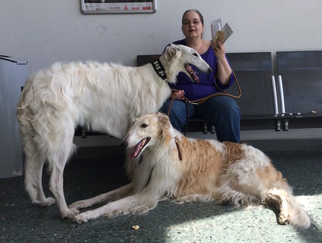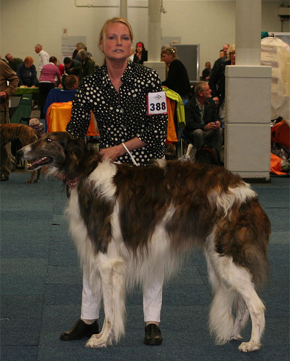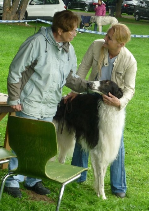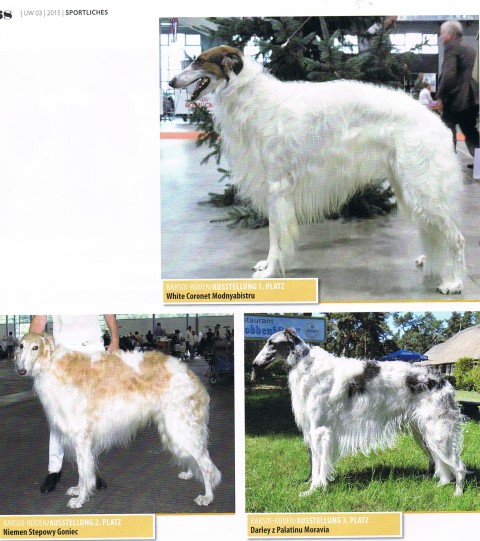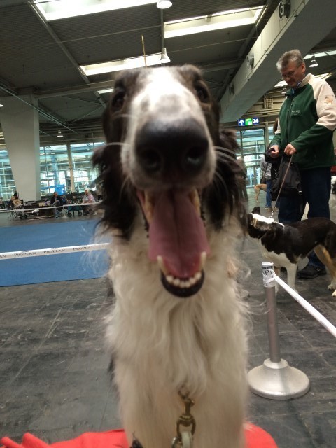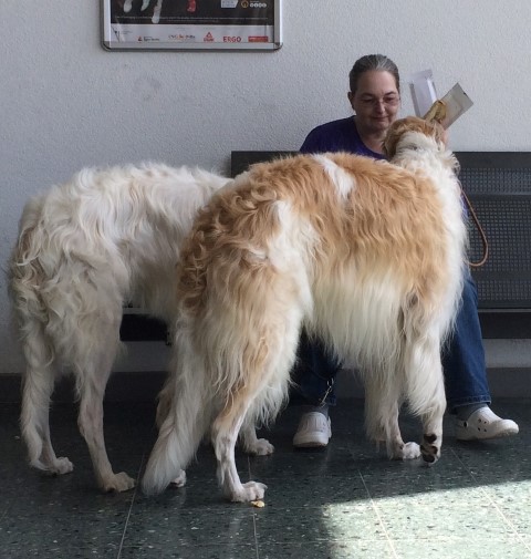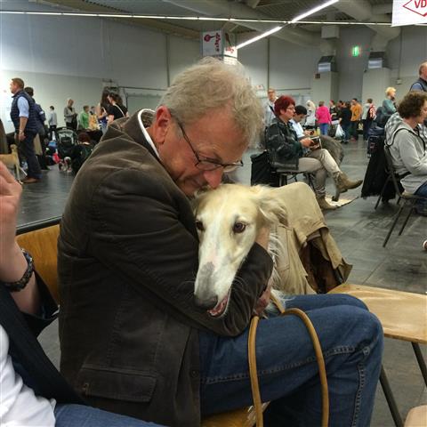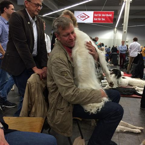 12.03.2015: Heute freue ich mich sehr mit Niemen, der es unter die ersten 3 geschafft hat: Er wurde 2.!!!! Und er ist "nur" mein Hund, ich bin ein "nomame", also kein besonderer Mensch in der "Barsoiszene": Weder Richter, noch sonst zu der Zeit als Züchter besonders bekannt! Und deshalb bin ich sehr glücklich über seinen 2. Platz!!! Ich habe ihn nur lieb und deshalb gerne ausgestellt ! Ich danke jedem, der mir geholfen hat, mir mit Rat und auch Tat zur Seite stand, besonders meiner Freundin Karin und Christoph und auch besonders Heidelinde, die mir viel an ihren Erfahrungen hat teilhaben lassen! Ohne sie alle hätte Niemen diesen Erfolg nicht geschafft, weil ich längst den Mut am Ausstellen verloren hätte. Niemen hat in den 3 Ausstellungen, auf denen er jetzt in 2015 schon war, 3 x V1 bekommen, 2 x BR und 1 x BOB! Ich freue mich, dass ich ihn habe, aber diese Saison soll ausstellungsmäßig seine letzte sein, weil er es sehr liebt, doch er hat es verdient, in den"Ruhestand" zu gehen. So denke ich, mal sehen, was er dazu sagt!?!? 09.03.2015: Live dabei: