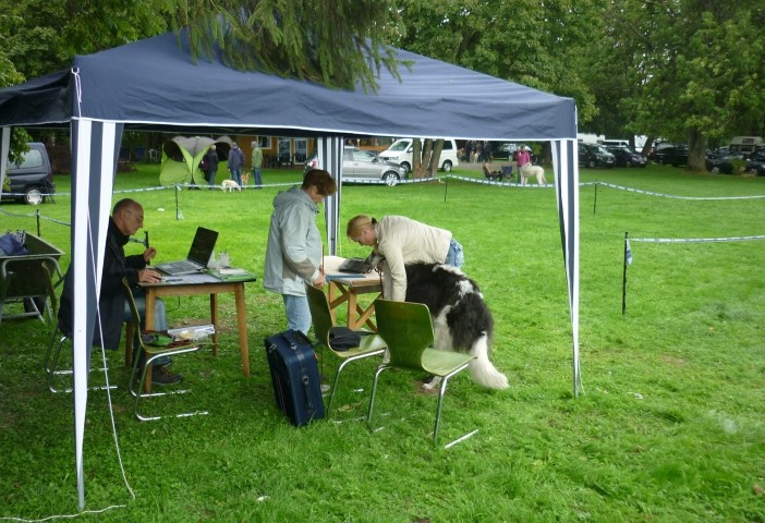 ![]() 19.09.2015: Heute soll Opal die "Lizenz zum Decken" bekommen! Also habe ich gestern den Beifahrersitz aus dem SLK ausgebaut und eine dicke Decke reingelegt, weil ich einfach keine Lust hatte, wegen eines Hundes die "Hundehütte" zu nehmen! Opal stieg ein, als hätte er nie woanders gesessen. Um 10:30 h starteten wir mit dem "Wesenstest"! Ca 30 Hunde waren angemeldet und somit dauerte es ganz schön lange, bis alle "durch" waren. Parallel führte Frau Peschges die "Formbewertung" durch. Das dauerte pro Hund z. T. zwischen 30-45 Minuten, denn Frau Peschges war sehr vorsichtig und lieb zu den Hunden, und gründlich! Bei Opal ging es jedoch recht zügig, er machte es ihr auch einfach. Über das Ergebnis konnte ich mich sehr freuen und auch seine "Wesensprüfung" bestand Opal mit Bravur. Ich glaube, alle Hunde haben bestanden. Schön war, dass meine Schwester und meinen Schwager extra da waren und wir Zeit hatten, uns viel zu erzählen.