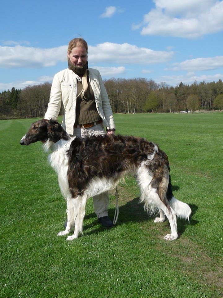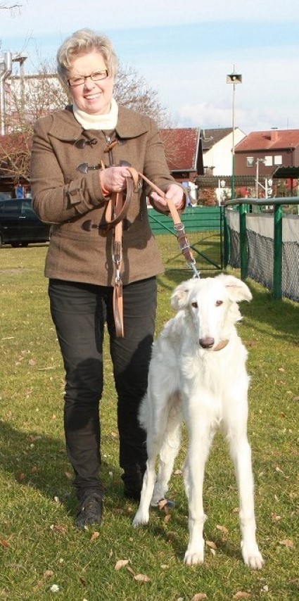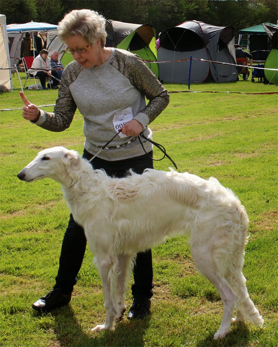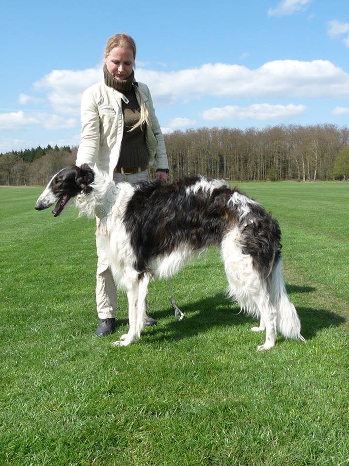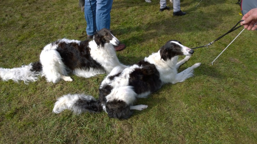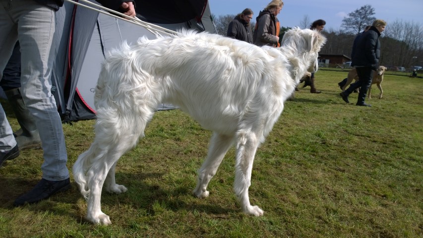 28.03.2015: Helle Aufregeung im Haus: Niemen hat mit voller Wucht das Schlafzimmertürgitter gerammt!!! Ich bekam einen Schlag auf die Achillessehne und konnte aber gerade noch verhindern, dass Katai von den umherfliegenden Trümmern erschlagen wurde! So hatten Niemen und ich schon mal unser Handicap im Freilaufen. Aber dann lief alles glatt, ohne Zeitdruck kamen wir in Ostercappeln an, das Wetter war traumhaft ( im Gegensatz zu gestern ) und alle Freunde waren da, wie versprochen, um auszustellen zu helfen. Dann fragt man sich: Wo ist der Pferdefuß? Den muß es doch geben! Und der bestand im Dualsystem. Amethyst gewann die Jüngstenklasse und holte sich auch später das Jüngsten-BOB, Opal bekam V2, Berendaij wurde mit V1 wieder erster und Niemen mit V2 zweiter, Olessia wurde bei den Hündinnen wieder erste und Olala mit V3 dritte ( Ausnahmen bestätigen bekanntlich die Regel ), Jakira Raschi-Pack-Buran kam in der Veteranenklasse wieder auf Platz 1. Und kaum waren die Barsois durch, schlug das Wetter um und aus Sonnenschein wurde Regen. Ich nahm meine Arbeit als Ringordner auf, fror, lernte viel über andere Rassen und am Ende des Tages waren wir alle glücklich und zufrieden, tranken Sekt und freuen uns schon auf das nächste Mal in dieser Runde.