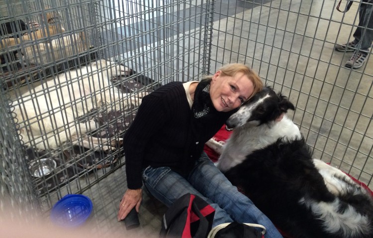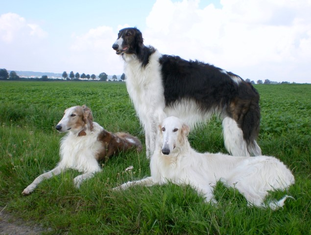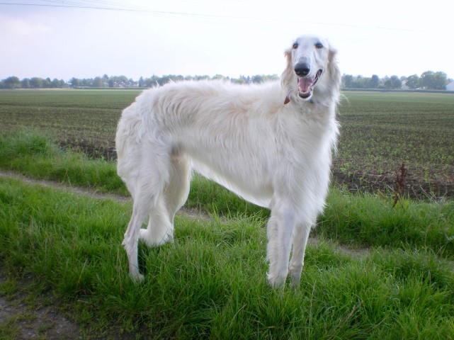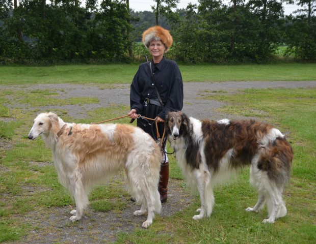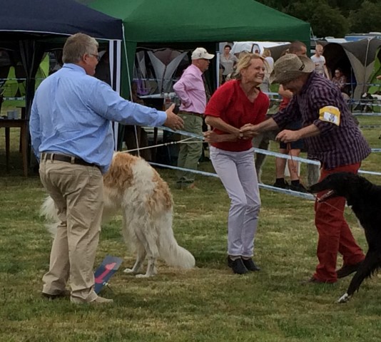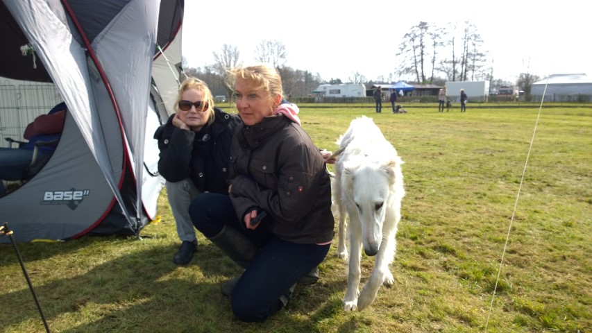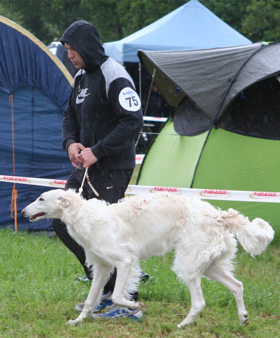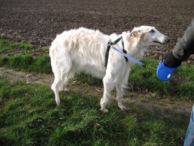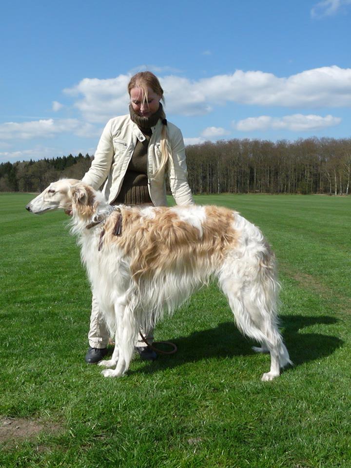 28.03.2015: Helle Aufregeung im Haus: Niemen hat mit voller Wucht das Schlafzimmertürgitter gerammt!!! Ich bekam einen Schlag auf die Achillessehne und konnte aber gerade noch verhindern, dass Katai von den umherfliegenden Trümmern erschlagen wurde! So hatten Niemen und ich schon mal unser Handicap im Freilaufen. Aber dann lief alles glatt, ohne Zeitdruck kamen wir in Ostercappeln an, das Wetter war traumhaft ( im Gegensatz zu gestern ) und alle Freunde waren da, wie versprochen, um auszustellen zu helfen. Dann fragt man sich: Wo ist der Pferdefuß? Den muß es doch geben! Und der bestand im Dualsystem. Amethyst gewann die Jüngstenklasse und holte sich auch später das Jüngsten-BOB, Opal bekam V2, Berendaij wurde mit V1 wieder erster und Niemen mit V2 zweiter, Olessia wurde bei den Hündinnen wieder erste und Olala mit V3 dritte ( Ausnahmen bestätigen bekanntlich die Regel ), Jakira Raschi-Pack-Buran kam in der Veteranenklasse wieder auf Platz 1. Und kaum waren die Barsois durch, schlug das Wetter um und aus Sonnenschein wurde Regen. Ich nahm meine Arbeit als Ringordner auf, fror, lernte viel über andere Rassen und am Ende des Tages waren wir alle glücklich und zufrieden, tranken Sekt und freuen uns schon auf das nächste Mal in dieser Runde.