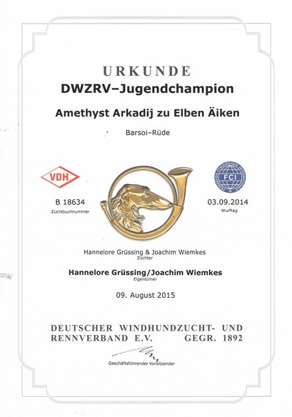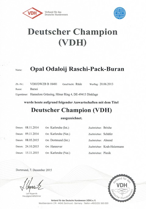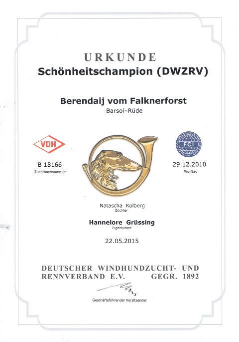 27.05.2015: Die 2.Urkunde ist jetzt auch da, jetzt ist es amtlich: Berendaij ist Dt. Champion VDH & DWZRV und wurde auch noch VDH-Frühjahrssieger 2015: