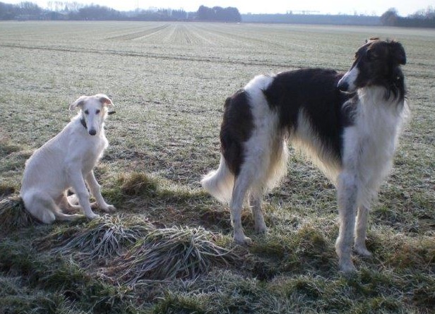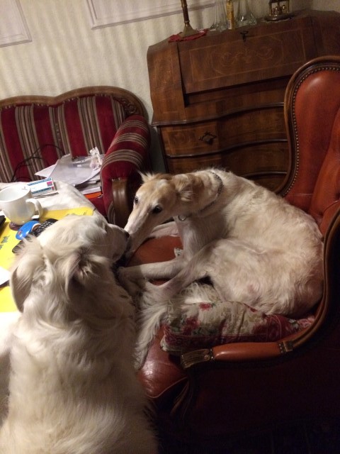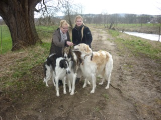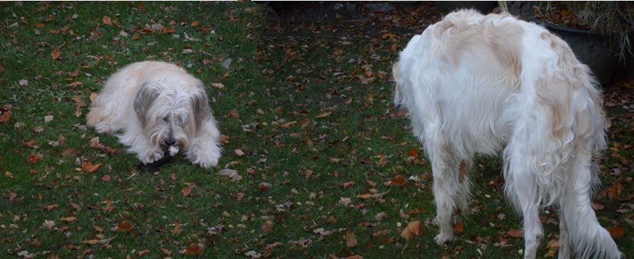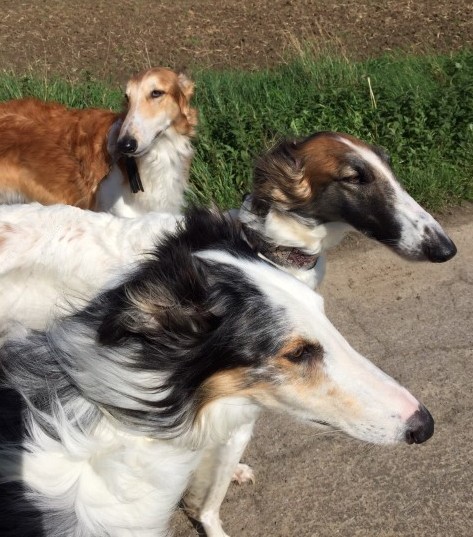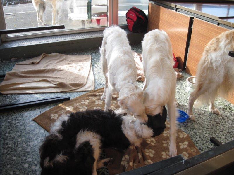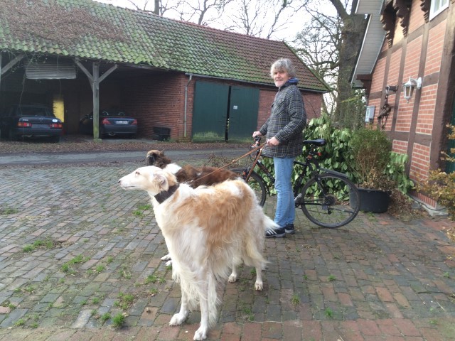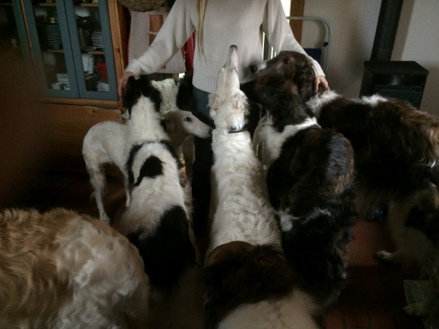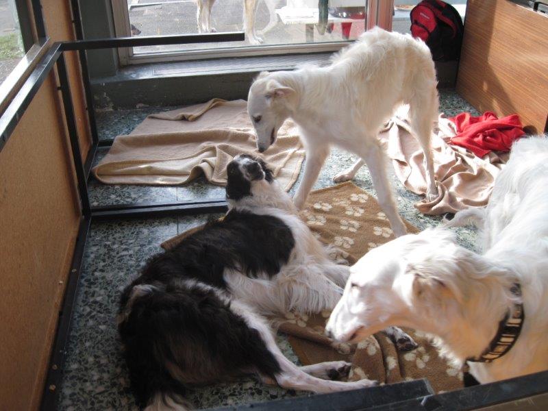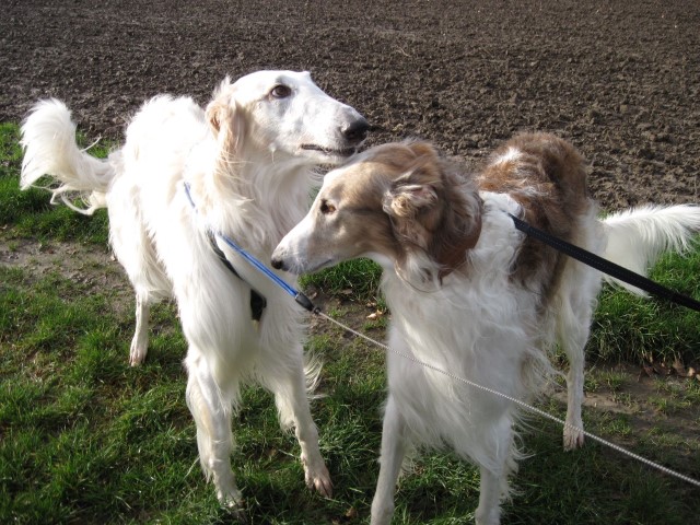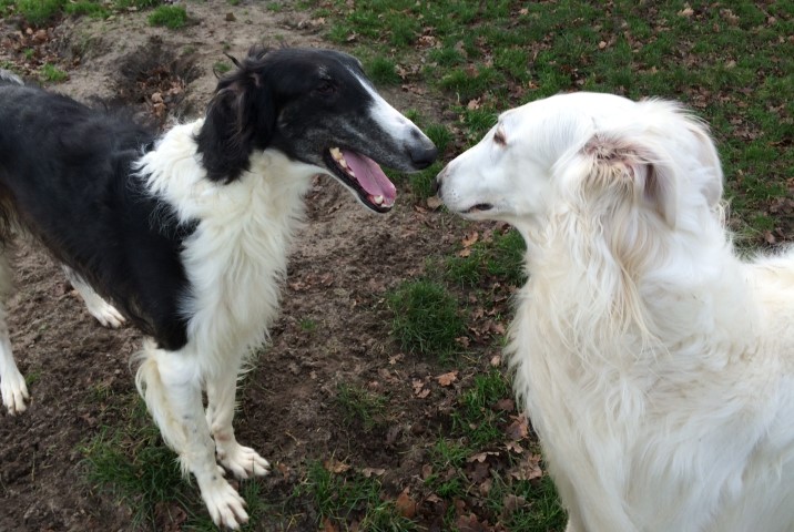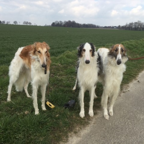 11.04.2015: Barsoijahresausstellung in Volkmarsen, ja, was soll ich dazu sagen: Nichts! Wir waren früh wieder zu Hause, denn mit 3 unplatzierten Vs brauchten wir ja auf nichts warten, doch irgentwie können wir ja froh sein, Vs bekommen zu haben, so, wie gerichtet wurde. So konnte ich noch ein wenig im Garten arbeiten, das war auch bitter nötig. Ich war auch nicht sonderlich überrascht über unser Abschneiden, denn schon in Dortmund hatte Herr Jackel Niemen und Opal schon keines Blickes gewürdigt. Somit war ich auch nur mit 3 Hunden da, und nicht, wie in Hoope, mit 7 Hunden am Start! Dabeisein war heute nur das Motto! Ich habe mich gefreut über das Wiedersehen mit Freunden und Aquamarin! Auch möchte ich allen Gewinnern und Platzierten von hier aus beglückwünschen! 07.04.2015: Volia freut sich und spielt mit Freunden.