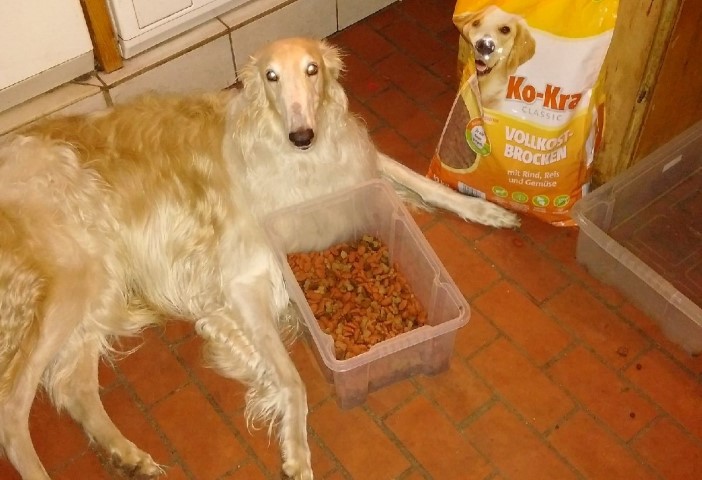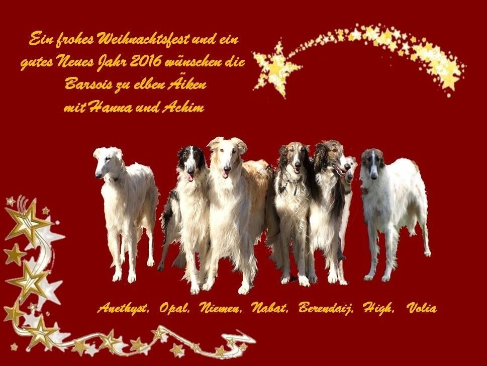 Unser Weihnachten! 22.12.2015: Heute bekam ich - völlig unerwartet - ein ganz besonders schönes, sehr persönliches Weihnachtsgeschenk: ![]() Ein handgemalter schöner Barsoikopf! Ich habe mich riesig darüber gefreut! Danke!!!! 18.12.2015: Heute war ein großer Tag für Berendaij, aber auch für Niemen! Beris Schwester und Niemens Frau Bohdana war bei uns zu Besuch! Alle Jungs waren ganz bezauberd und freundlich und vorsichtig! Bohdana legte sich nach ausgiebigem Spielen einfach hinter mich auf meinen Platz und fand das sehr angenehm - ich weniger, da ich kaum noch sitzen konnte. Sie darf uns gerne öfter besuchen, sie ist allerliebst. 15.12.2015: Mich hat es arg erwischt!!! Hier ein kleiner Teil der Medis, die ich schlucke! Alle 2 Stunden "belle" ich gnadenlos los, die Barsois bleiben z. T. schon nachts lieber draußen im Hundezimmer, die anderen verkrümeln sich weit vom Schlafzimmer weg, Achim schläft schon auf dem Sofa. Durch das permanente Husten bekomme ich schon einen "Sixpack", aber mit Schmerzen! ![]() 12.12.2015: Heute möchte ich schon mal vorab ein kleines Resümee ziehen, z. B über Niemens Kinder, er ist der Vater von 2 Würfen! Alle haben einen tollen Platz in ihren neuen Familien bekommen, und dass ist heutzutage sehr wichtig! Aber sie sind ja auch alle wunderschön und toll im Charakter, und da es ja so viele Barsoiwelpen und Junghunde gibt, die auf ein gutes Zuhause warten, ist es schön, dass alle unsere Kinder problemlos ein neues Zuhause fanden! Ich bin sehr dankbar dafür! 11.12.2015: Nessa ( Oblonka): Wie schön sie ist!!! ![]() Ein Foto von Niemens Tochter Pina, die jetzt in der Schweiz wohnt: ![]() Auch ihre Geschwister wohnen da jetzt. 10.12.2015: Ich freue mich! Ich habe ein schönes Hotel für Langerwisch gefunden und das wird unser "Saisonauftakt 2016"! Doch erst steht Weihnachten vor der Tür. Karin und ich haben schon eine Liste für das Weihnachtsessen erstellt, mh, das wird lecker! Und endlich ist sie da, die Urkunde für Opal!!! Und Achim zückte das Handy! ![]() ![]() 07.12.2015: Das Ende!!!! Nun, man sollte es besser wissen, doch man vertraut den "Lieben" immer wieder, wer mag schon einen "trockenen" Stutenkerl? Na, jetzt wissen wir`s! Ich hab`s! Wollt ihr auch noch was ab? Danke, war lecker! Ja, und das blieb über! Achim ist empört!!!! Aber wir sind nicht allein: Auch in Köln sind die Jungs sehr interessiert an der "Küche"! ![]() Zum Frühstück bekam Achim, nach alter friesischer Tradition, einen Stutenkerl! Und unsere Wollsau einen "Husumer Protest-Eber" namens "Bertus"! 06.12.2015: Es ist Nikolaus! Mal sehen, was er für uns mitgebracht hatte. ![]() Wieder zu Hause: Opal war so froh, seinen Freund Amethyst wieder zu haben! Erst leckten sie sich inbrünstig die Ohren, dann kuschelten sie ganz entspannt..... Kassel: Wir hatten einen schönen Abend und waren trotzdem gut ausgeschlafen, frühstückten alle 3 wieder lecker, chekten aus und fuhren zur Messe. Diesmal ging es reibungsloser durch den Einlaß, auch waren viele andere Barsois am Start, aber unsere Situation war ja ähnlich gleich wie gestern: 15 Monate, jetzt 3 Tage! Doch jetzt waren die vielen Afghanen vor uns. Wir hatten somit reichlich Zeit. Schöne Gespräche, wie auch am Vortag, verkürzten unsere Wartezeit. Ich konnte Achim nicht erreichen und machte mir viele Sorgen! Doch dann mußten wir in den Ring, und: Amethyst gewann wieder! Welch ein Glück!!! Er bekam sogar in Stechen das Res.-CAC und als besonderes Nikolausgeschenk erben wir das CAC! So hat er nun das 2., jetzt internationale VDH! Aber die Sorge um Achim ließ uns nicht los, wir fuhren sofort heim! Gott sei Dank ging es Achim wieder etwas besser, das wichtigste Geschenk! ![]() Aber hatte noch einiges mehr für uns als Überraschung bereit: Neue Bilder von einem ganz besonderem Banditen und seiner Gang, Aquamarin!