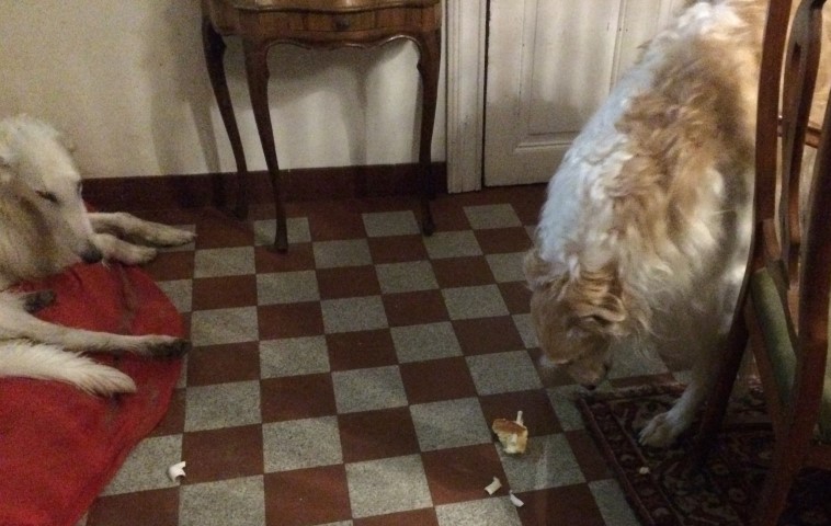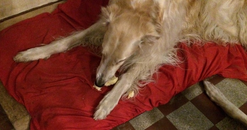 05.04.2015: Ich war zum Osterfeuer! Es war sehr, sehr schön! Anschließend haben wir gegrillt, und wieder zu Hause haben die Barsois ein "Ostermahl" serviert bekommen. Soweit, so gut. Ich habe, da es doch recht kühl war, wie üblich, den Ofen und den Kamin angezündet. Aber einer unserer Hunde ist richtig blond. Nun nicht mehr!!! Mir fällt dazu nichts mehr ein.