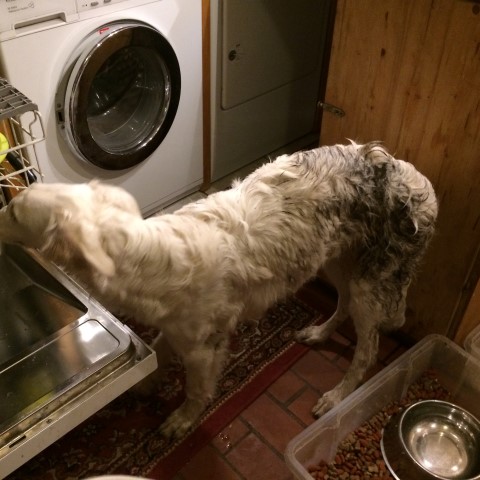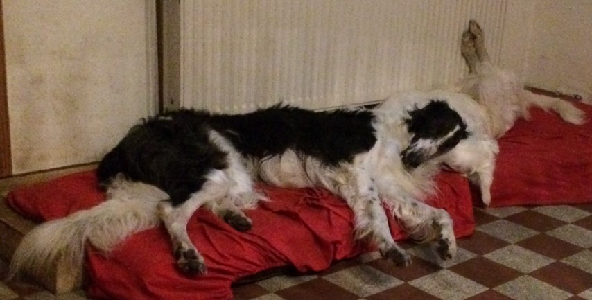 02.04.2015: Es ist richtiges Aprilwetter: Sonne, Schnee, Hagel und Regen! Die Hunde sehen auch entsprechend aus! Und morgen müssen wir nach Hoope! Wie soll das werden?!? März: