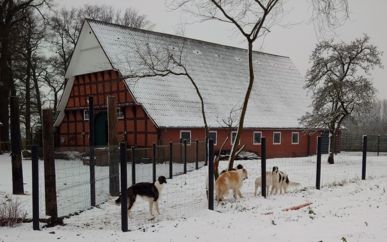 24.01.2015: Auch bei uns in Dinklage schneit es heute ( ausnahmsweise ). Der Himmel ist grau, der Schnee eigendlich auch! Und die Hunde dreckig! Aber sie haben Spaß!
