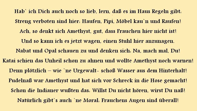 Aquamarin will auf den Schoß, Fokko paßt auf Opal auf, Niemen schmust mit Wilfried und Dorosha und Amethyst sind rechtschaffen müde!