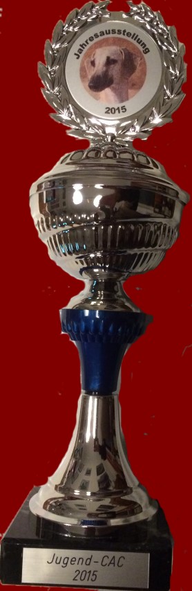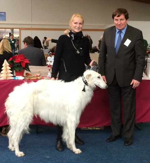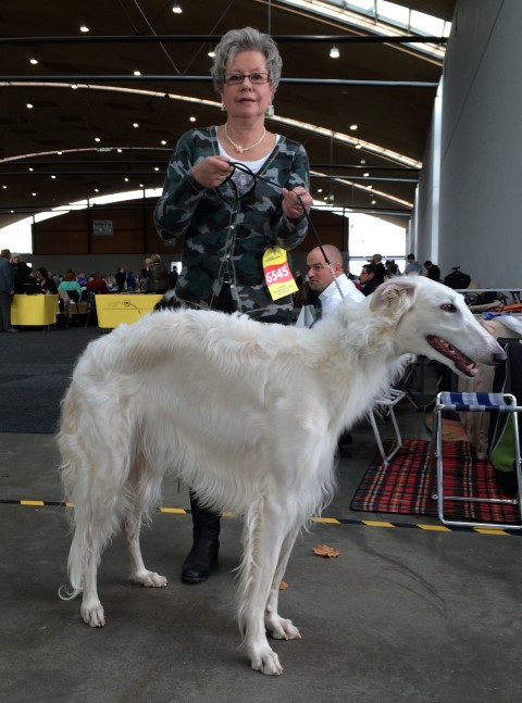 Heute waren wir nicht so gut in Form, allen steckte der gestrige Tag noch in den Knochen und wir hätten fast verschlafen! Dennoch reichte es für 2 erste Plätze und für Opal zum Res. CAC und für einen 2. Platz! Das alles bedeutet für Opal, dass er mit 16 Monaten schon in der "Warteschleife" für das VDH-Championat ist! Unser "Edelsteinchen" hatte zum ersten Mal in seinem kurzen Leben einen Auftritt unter strenger richterlicher Aufsicht und wurde für VV1 befunden, wäre er denn schon in der Jüngstenklasse, doch mit 4 Monaten..... ! Zumindest hat er schon mal "Hallenerfahrung" sammeln können und ist bislang unser coolster Junghund, mit dem wir je auf einer Hallenausstellung waren! 17.01.2015: Unsere erste Ausstellung in diesem neuen Jahr, und das schon im Januar! Aber Münster ist nicht so sehr weit. Unser kleiner "Edelstein" Amethyst mußte auch mit, er kann ja nicht den ganzen Tag alleine bei den zu Haus gebliebenen Großen bleiben! So fahren wir mit 4 Barsois in die Münsterlandhalle. Unser Kleiner benahm sich wie ein Großer: Ganz suverän durchschritt er die Hallen mit den Verkaufsständen und ging wie am Schnürchen an allen anderen Hunden vorbei! Da wir früh da waren, konnte ich auch kurz mit ihm in den Ring, und auch das machte er cool! Ich freute mich, viele Bekannte zu treffen, se war ein schöner Tag ( trotz Halle und trotzdem, dass die DWZRV-Ringe alle als einzige ohne Teppig waren! Es war sehr glatt! ) Opal gewann die Zwischenklasse mit V1 und auch das Stechen um das CAC, Niemen bekam sein V1, VDH in der Championklasse und wurde bester Rüde und auch Berendaij gewann die offene Klasse mit V1, VDH. Wir haben uns sehr über Opals erstes CAC gefreut! Aber natürlich auch über unsere anderen! Ganz lieben Dank an Claudia und Christoph!