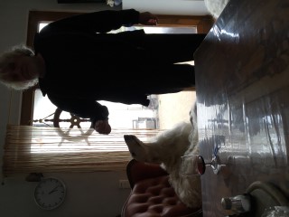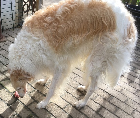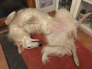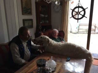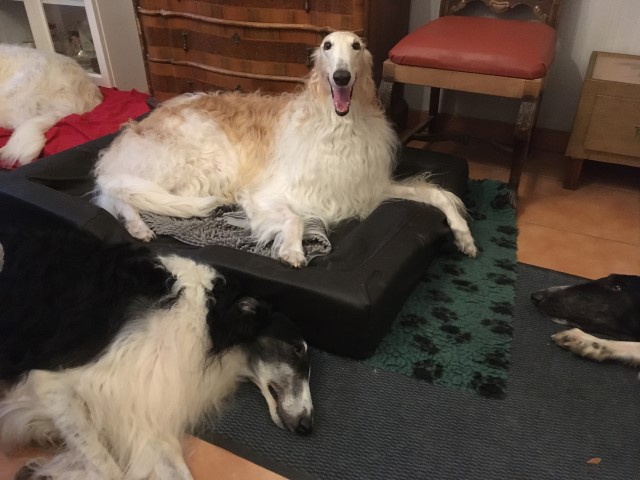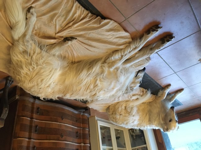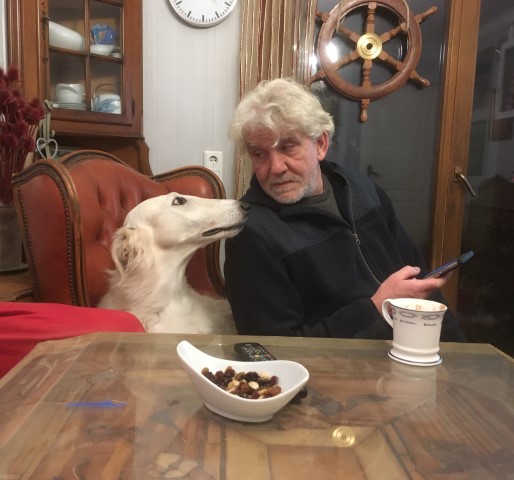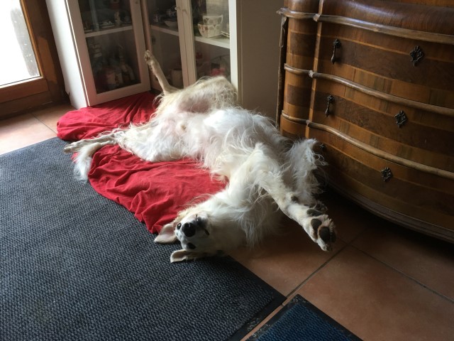 Ist ja gut, ich stehe ja schon auf, laß Makawi raus und geh ins Wohnzimmer! Und ich habe es tatsächlich geschafft, dass alles sauber blieb, bis er wieder kam! Huch, die Barsois hatten es damit nicht leicht, ich auch nicht, bei dem Dreckswetter immer Füße abwischen!