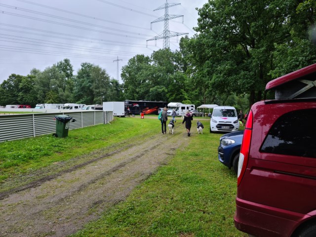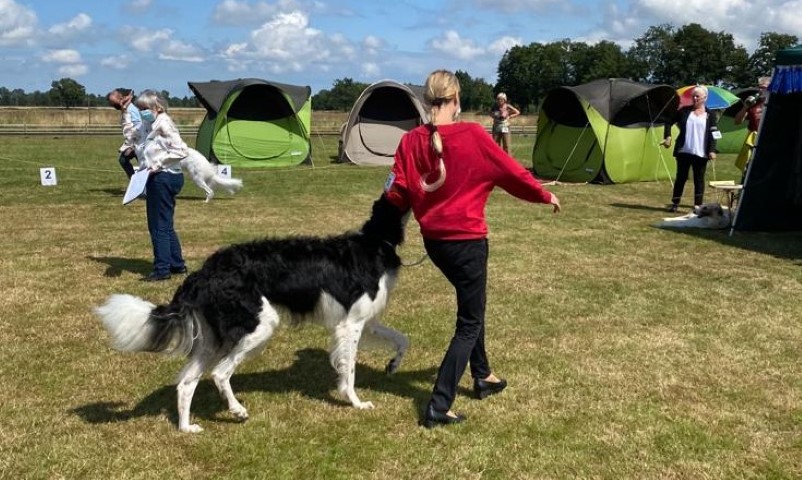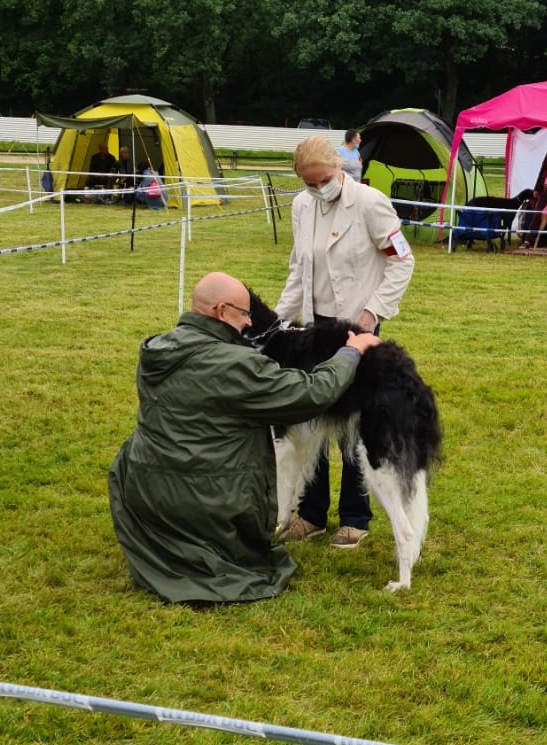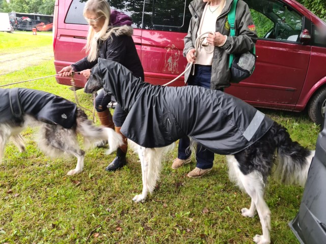 04.12.2021: Früh klingelte mein Wecker, ein Blick zur Seite zeigte mir, Achim war schon auf. Er saß gut gelaunt in der Küche, Tasse Kaffee, hatte die Barsois schon rausgelassen und war eigentlich abfahrbereit. Ich hingegen brauchte noch eine gute Stunde. Die längste Zeit nahm das Aussuchen und Anziehen in Anspruch, Weiberkram eben. Unter gehörigem Abschiedsgeheule fuhren Achim, Opal, Beryll und ich nach Kassel. Sonst bin ich immer total aufgeregt, heute war ich die Ruhe selbst! Ob es am Stoßgebet und der Kerze im Dom lag? Vielleicht, vielleicht aber auch, weil ich mir nichts ausrechnete! Opal war immer noch zu dick, und Beryll hatte immer noch kaum Schmuckhaar! Doch für Beryll war diese CACIB so unendlich wichtig, er braucht ja eine SG-Bewertung für die FCI-CACIL-Lizenz! Und trotzdem war ich ganz ruhig. Viel hatten wir nicht mehr üben können, denn es war nur noch Matsch und naß im Paddock. Als wir ankamen, sahen wir schon die KM-lange Schlange (n), die sich zum Einlaß drängten. Wir waren jedoch früh genug. Dennoch verzögerte sich der Richtbeginn um ca eine 3/4 Stunde, bis alle Gemeldeten endlich an unserem Ring waren.