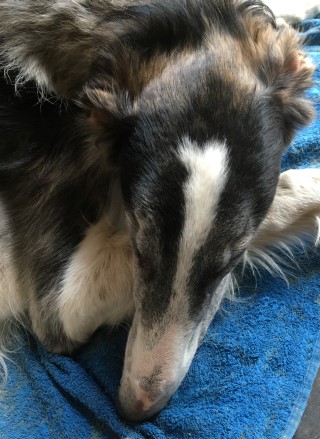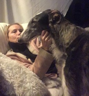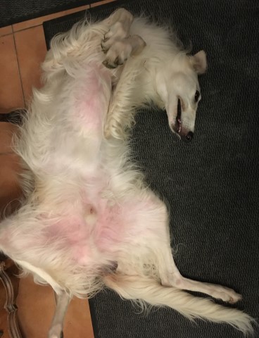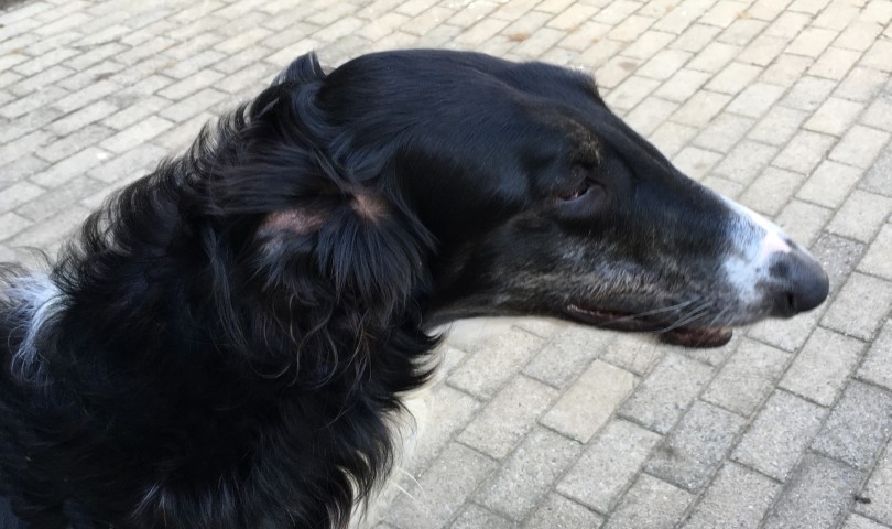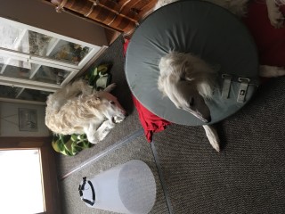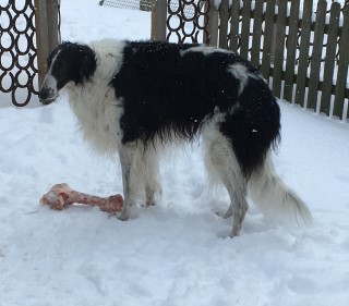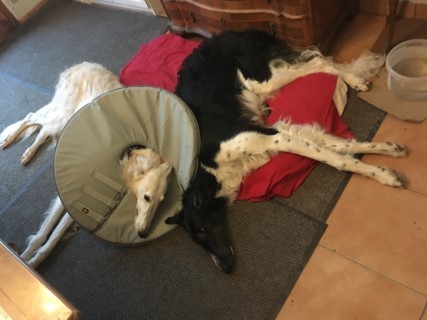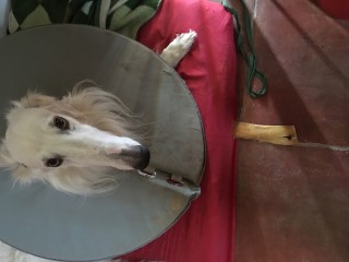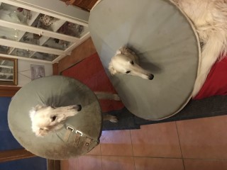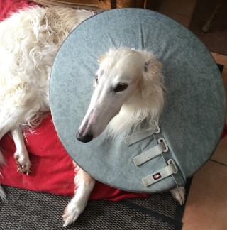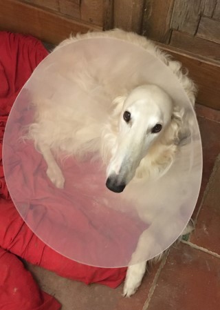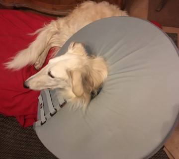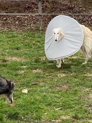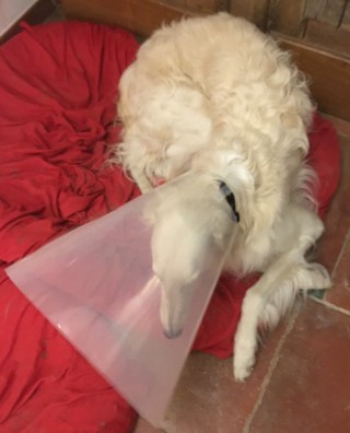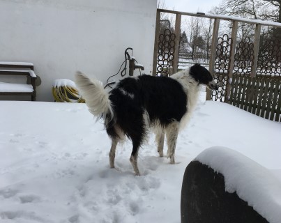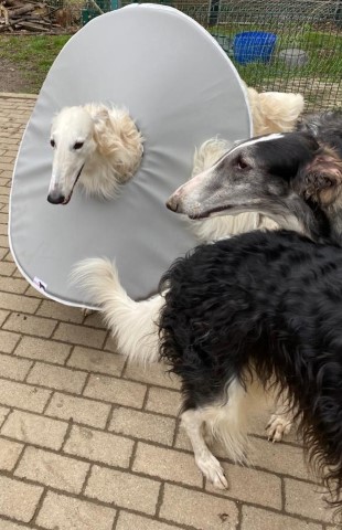 17.02.2021: Heute liegt kaum noch Schnee! So schnell, wie er kam, ist er auch wieder geschmolzen. Und ich habe Brilliant die Fäden gezogen. Allerdings muß er seine Tüte noch echt lange tragen. Nun ist er ein "Depri-Barsoi"! Kann ich gut verstehen.