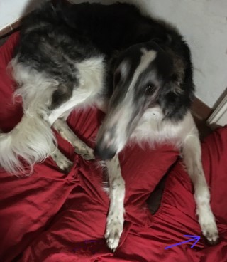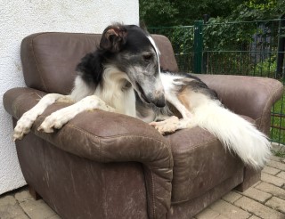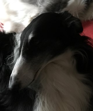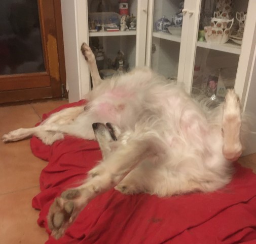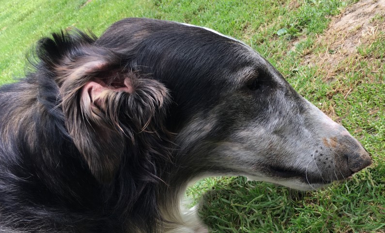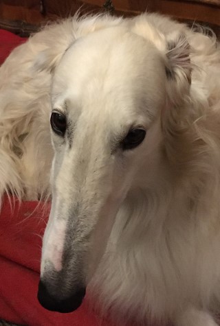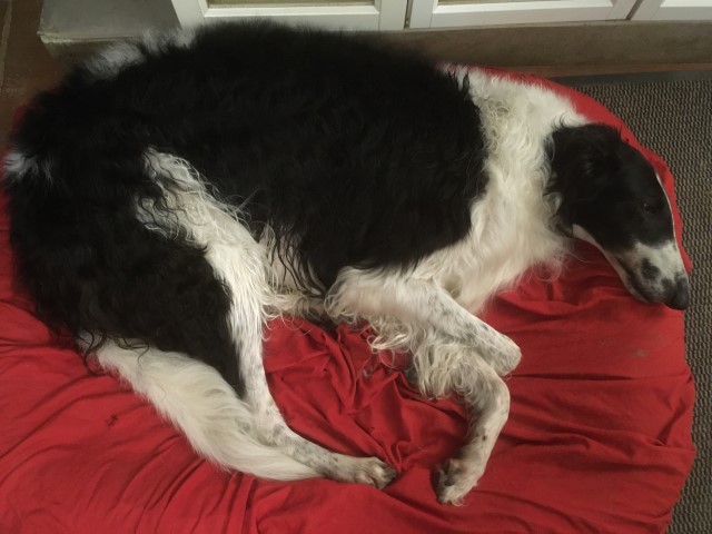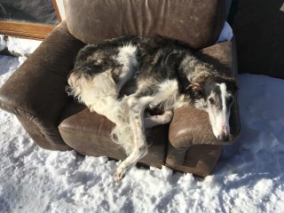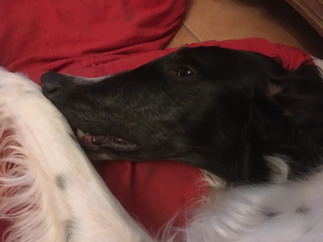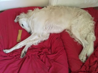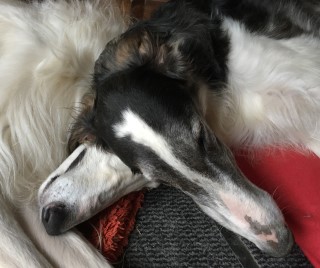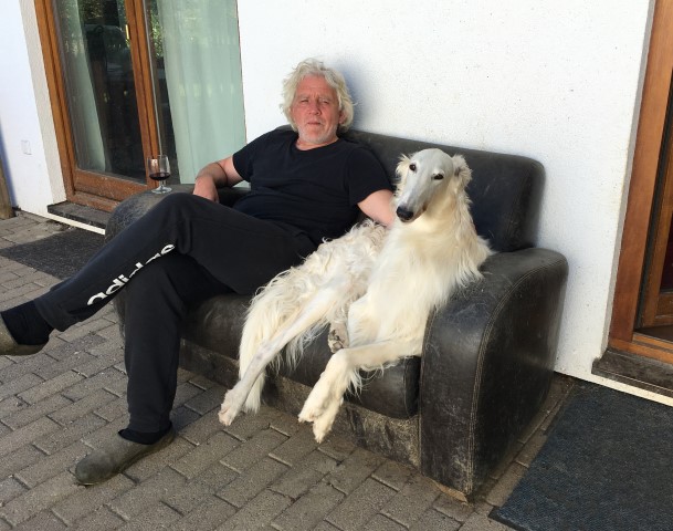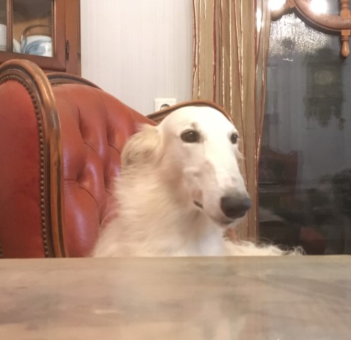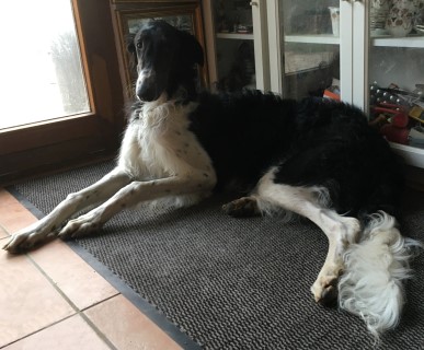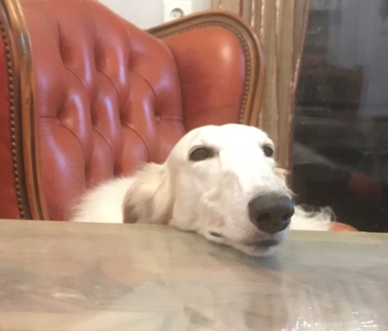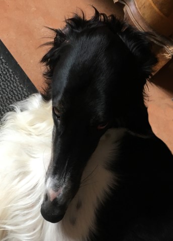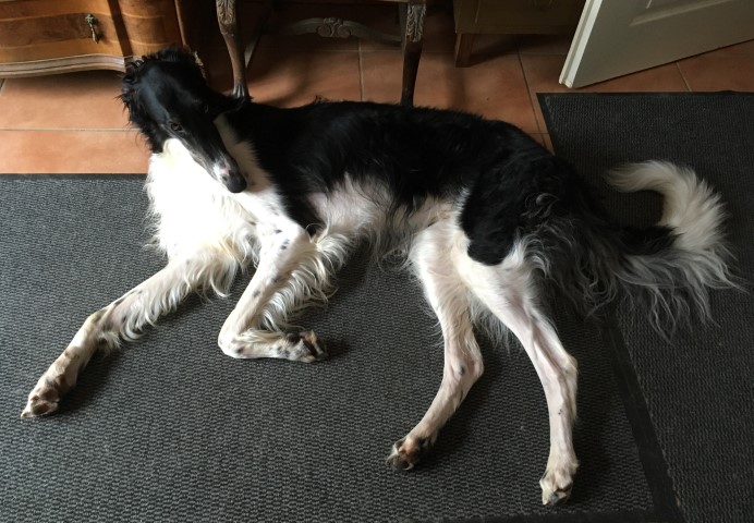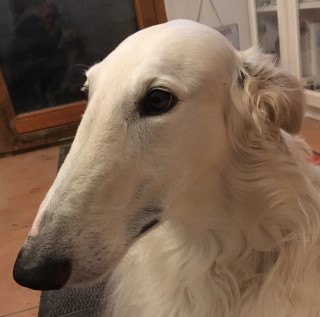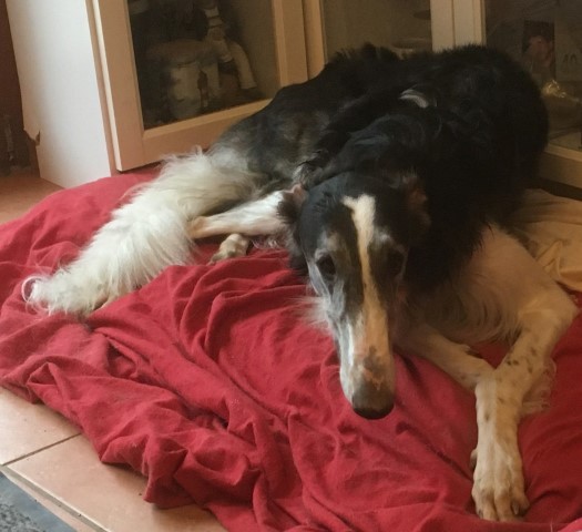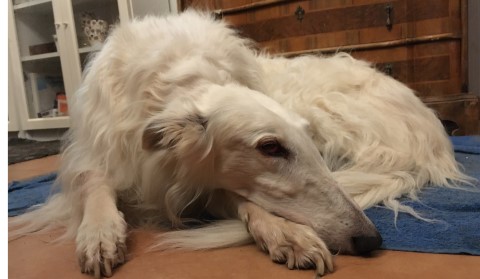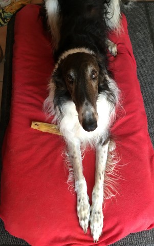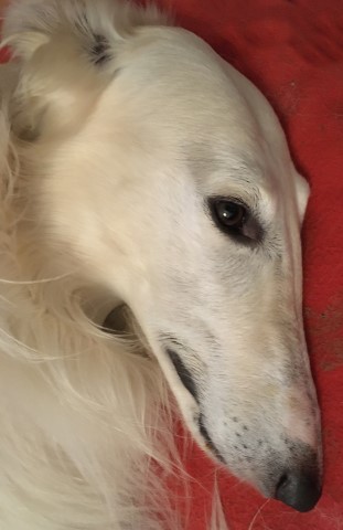 Amethyst Arkadij zu Elben Äiken,03.09.2014, B 18634, Band XLVISighthound of the Year 2017 in Schönheit und Leistung Dt. Champion Schönheit & Leistung, Dt .Champion VDH, Dt. Champion DWZRV, Dt. Jugend-Champion DWZRV, Dt. Jugend-Champion VDH, DWZRV Coursing-Champion, LU-C, CACIL-Prüfung Verbandssieger 2019, Landessieger Niedersachsen-Sachsen-Anhalt 2019, DWZRV-Sieger 2018, DWZRV-Sieger S&L 2018, Anniversary Winner Donaueschingen 2018, Landessieger NRW 2018, Landessieger Weser-Ems 2018, DWZRV-Sieger Schönheit&Leistung 2018, German-Winner 2016, Alpensieger 2016, ( Sieger Baden-Württemberg 2016, Sieger Karlsruhe 2016), Landesjugendsieger Weser-Ems 2015, Landesjugendsieger NRW 2015, Bundesjugendsieger 2015, Q. f. crufts 2016, Wellhaar, weiß, DM-frei, DCM-frei Körung am 04.07.2016, Prädikatskörung für Schönheit und Leistung am 22.11.2016 Amethyst hat die Leistungsurkunde Coursing und die CACIL-Prüfung, die ihn berechtigen, in der Gebrauchshundeklasse zu starten. 3 CACIBs, Ranglistengewinner Schönheit 2016, Ranglistengewinner Coursing 2017 V1, VDH, CAC, Bester Rüde, Anniversary Winner Donaueschingen 2018, aus der Gebrauchshundeklasse heraus! Ich habe es ja gesagt, die Seite ist voll, und das bei "kleiner" Schrift! Hoffentlich ist Amethyst jetzt zufrieden. Außerdem haben wir unsere Kübelpflanzen "aufgestallt", sie überwintern im Welpenzimmer, wie jedes Jahr. Und dann noch ein Foto von der langen Nase von Knjas. So kann man auch liegen.