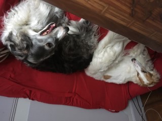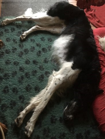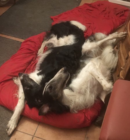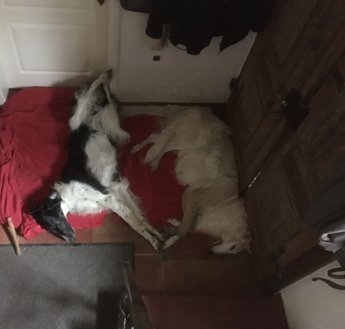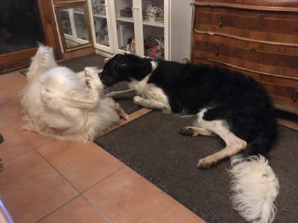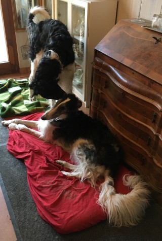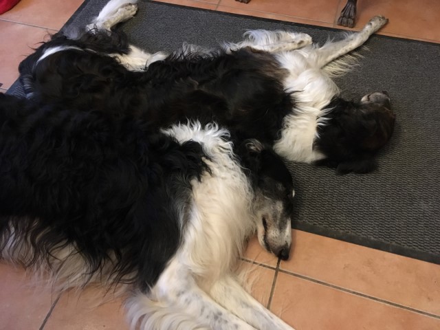 26.12.2021: Ein bißchen wurde noch "gebastelt", doch dann genossen wir den Tag auf dem Sofa. Das Wetter war grau, am Nachmittag begann es etwas zu regnen, also: Wir verpaßten nichts. Die Barsois jedoch wollten - wie immer, und jetzt besonders - raus und rein. Natürlich kamen sie mit dreckigen Füßen! Was das für uns bedeutet, das weiß jeder "Mehrhundehalter"!