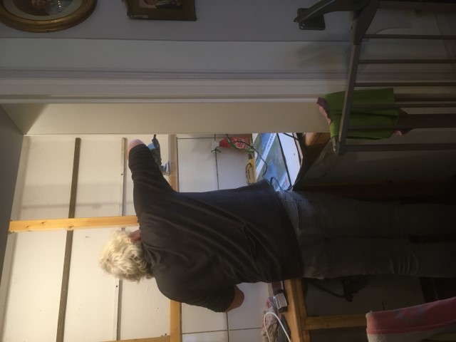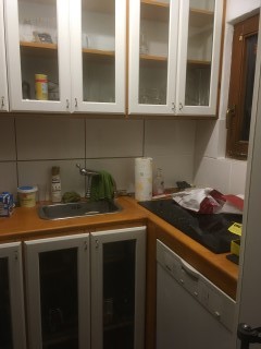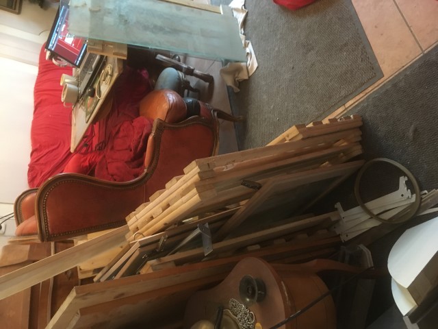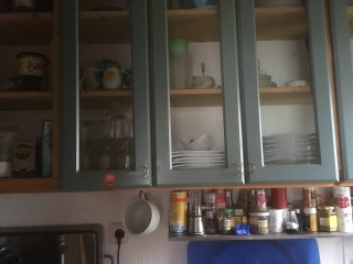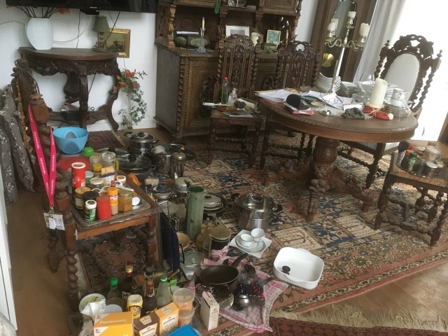 Die ausgeräumte Küche, das volle Wohnzimmer, die von mir abgebeizten Schranktüren und Böden ( Schittarbeit! Meine armen Fingernägel!!!)