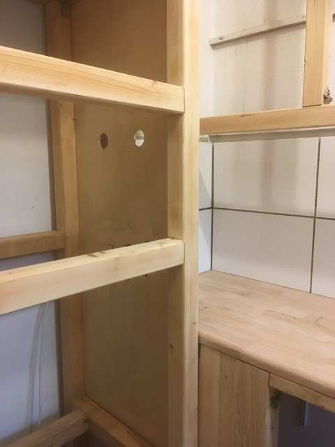 Die Fliesen sind dran, müssen noch verfugt werden. Doch zuvor muß die Arbeitsplatte noch geschliffen werden, auch das andere "Holz", viel Arbeit!