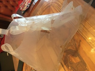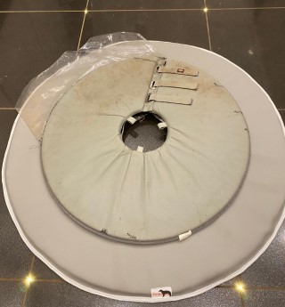 Zuerst habe ich mühevoll die Tüte verschmalert, also die Breite gekürzt und neue Schlaufenlöcher geschnitten, damit ich sie zusammenstecken konnte. In der Originalgröße würde er kaum durch die Tür passen. Und da sitzt er nun, und schaut mich vorwurfsvoll an! Doch ich kann ja auch nichts dafür! Doch dann geschah ein kleines Wunder: Unangekündigt kam die bestellte Kragenscheibe!