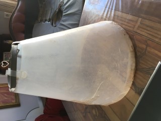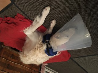 03.02.2021: Gestern wurde Brilliant in Dinklage operiert! Er hat bislang alles gut überstanden, hat guten Hunger und genießt die extrem hohe Aufmerksamkeit, die er bekommt. Da er einen sehr langen schmalen Kopf und einen recht langen Hals hat, paßten die handelsüblichen "Tüten" nicht. Somit gab es für ihn eine extra lange, auch hatten wir vorsorglich einen ganz großen Schutzkragen bestellt.