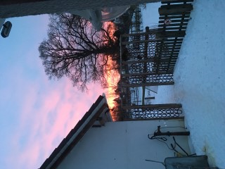 15.02.2021: Der Tag begann mal wieder etwas ungewöhnlich, mich weckten nicht, wie gewöhnlich, die Barsois, sondern Sturm! Das pfiff ganz schön laut und die Bäume bogen sich. Ich nutzte die Gelegenheit, die haarige Familie zu wecken, raus, Pipi machen! Dann sah ich, dass die Welpenzimmertür sperrangelweit aufstand. Und ich? Ich mußte - nicht angezogen, Barfuß - raus, sie schließen! Brrr! Ich sah, während ich auf die Lieben wartete, den Himmel! Wunderschön, knallrot.