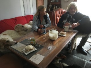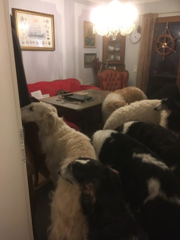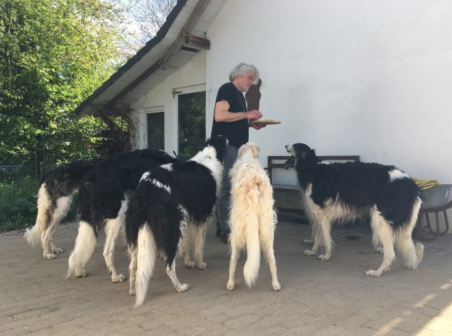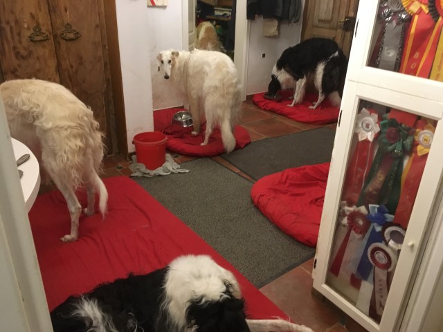 Achim ist aus der Stadt zurück, 7 Barsois in der Küche. Um den Tisch decken zu können, bilden die Lieben eine "Rettungsgasse", sonst wäre ein Transfer zwischen Tisch und Kühlschrank nicht möglich!