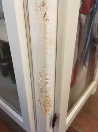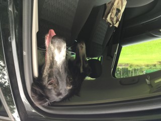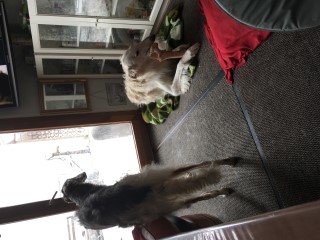 Knjas zeigt hier, wie die verschmierten Scheiben zu Stande kommen! Sie wollen rein, ebenso zeigen sie, wie sie raus wollen. Knjas fing damit an, und alle anderen eiferten ihm nach, denn so schnell ist Frauchen ja noch nie gesprungen, schließlich sollen die Scheiben und das Fenster nicht verkratzt werden! Schlaues Volk!