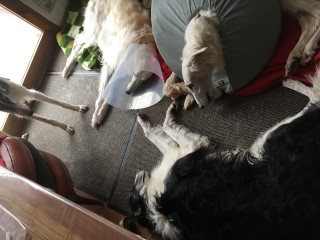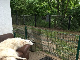 16.02.2021: Es taut! Das bedeutet: Ein grauer Tag, kein Sonnenschein! Schade. Beryll hat einen großen Knochen von draußen reingetragen. Erst kaut er ihn, dann Knjas, Als alle wieder raus wollten, nutzte Amethyst die Gelegenheit und schnappte sich ihn. Friedlich liegen die anderen drum rum.