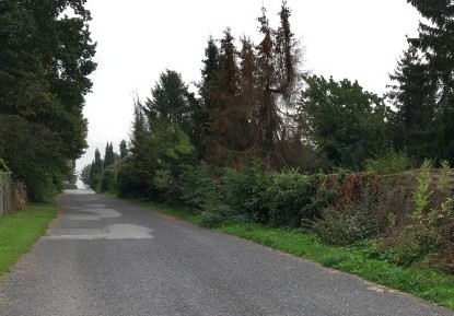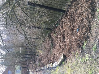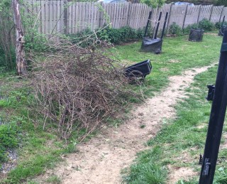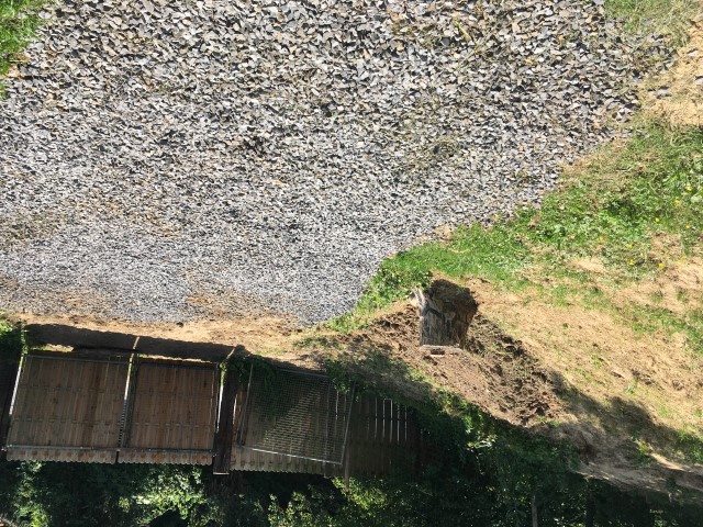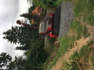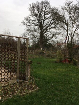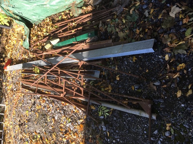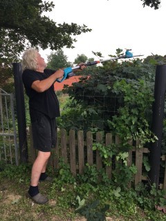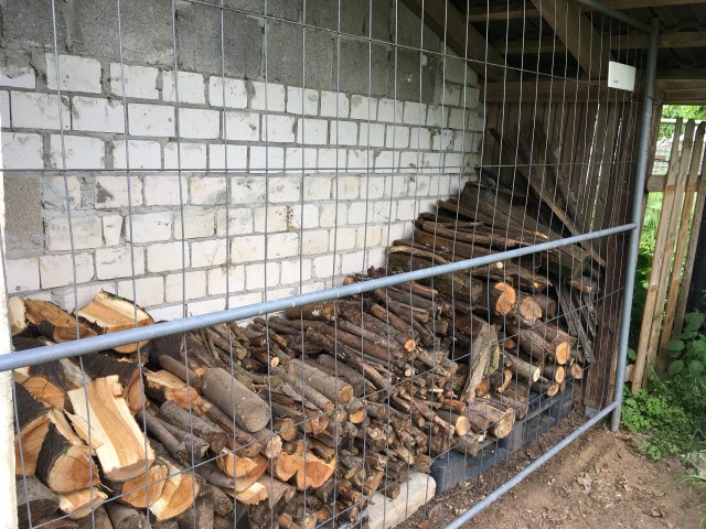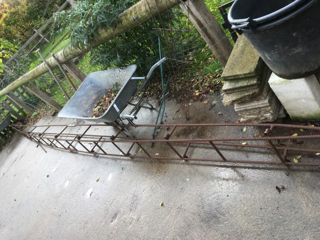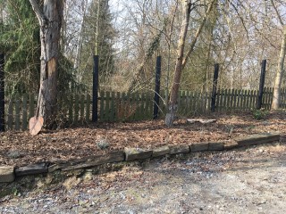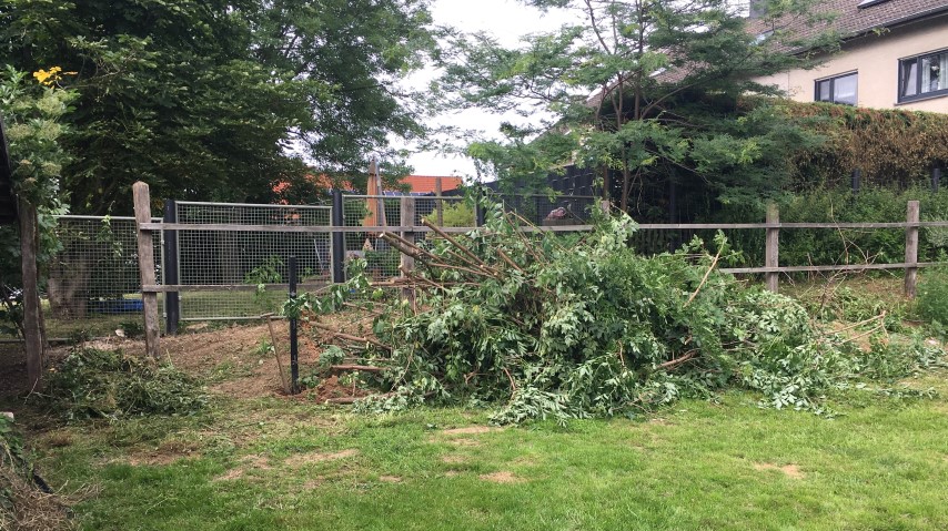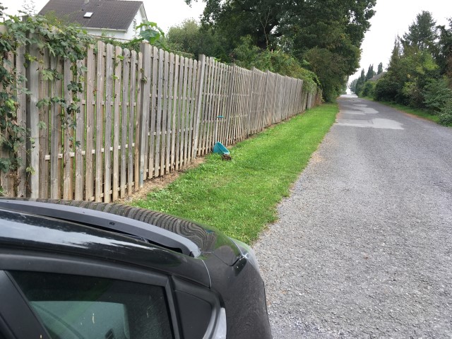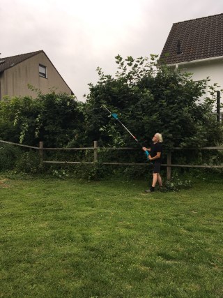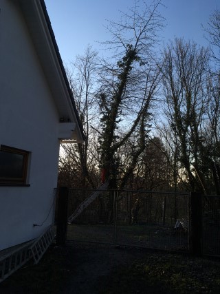 Der große Ast und die Tauben! Das ist mein Parkplatz, und die Tauben sitzen auf dem Ast darüber und ihre Hinterlassenschaften landen auf das arme Auto! Jetzt ist Schluß damit! Achim schnappt sich die Säge und ab ist der Ast!