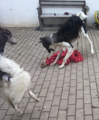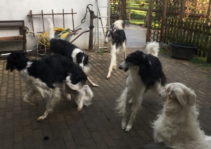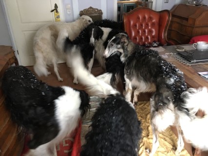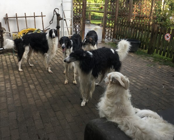 04.02.2021: In den letzten Tagen wird für den Windhundsport ein 2-Klassensystem ( s. Thema der Woche ) heiß in dem Foren diskutiert. Mit großer Freude darf ich festhalten, dass meine S&L-Hunde Amethyst, Opal und Brilliant die ggf neu zu beschließenden Sportauflagen voll erfüllen. Das hätte auch für den verstorbenen Niemen gegolten, der noch im Alter von 5 Jahren seine coursing-Lizenz gemacht hat und auch noch an ein paar coursings teilgenommen hat. Sogar Brilliant, der auf Grund von Corona nur 2 coursings laufen und auch keine weiteren CACIB-Ausstellungen besuchen konnte, hat schon meherer CACIB-V-Platzierungen und ein CACIB.Die "dunkle Fraktion" ging geschlossen raus! Und es wird gespielt! Nur Sir Odaloij ist nicht zu erkennen, er steckt teilweise hinter Paul! Die "Tütenträger" verweilen träge im Haus.